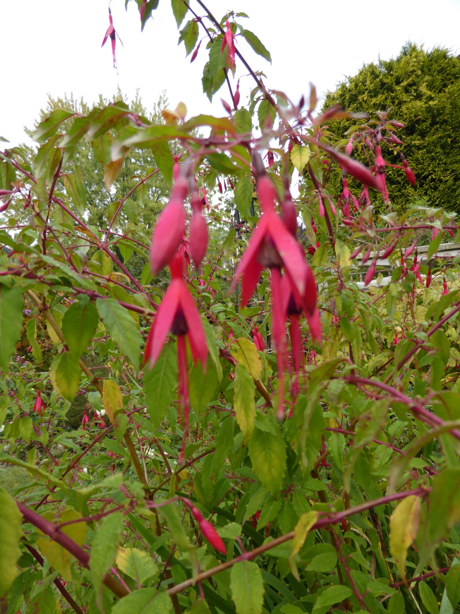 Wind und Regen haben Anfang der Woche die Triebe, die – von der Schnur gehalten – so einigermaßen aufrecht waren, über die Schnur abknicken lassen, während die, die schon fast am Boden lagen, nun halt ganz am Boden liegen. Ich müsste eine Anbindetechnik finden, die ausreichend stützt .. .. es soll dann auch noch einigermaßen natürlich aussehen.
