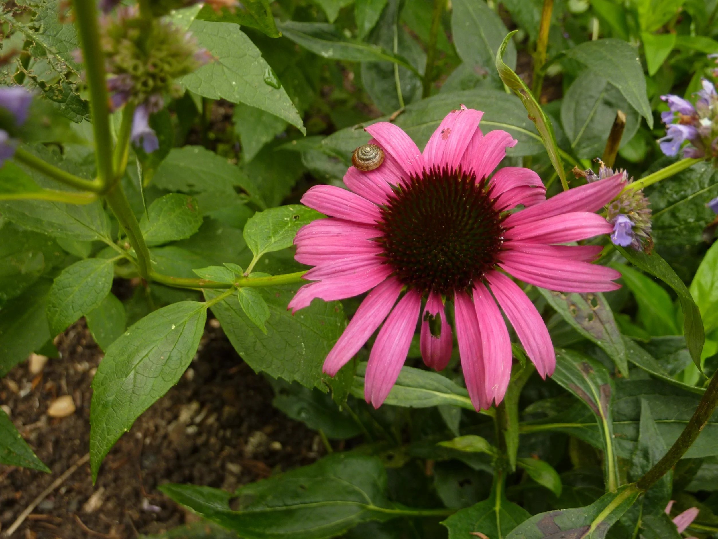 Echi mit einem Schneckengast, Rose Bonica, Alstromeria, Bartfaden, ?, Stockrose Parkrondell, ? , Sommerflieder, Katzengras, Scheckenknöterich, Duftnessel im Hintergrund, Sedum und Campanula und noch eine Aster.