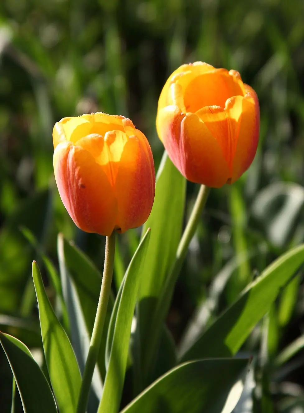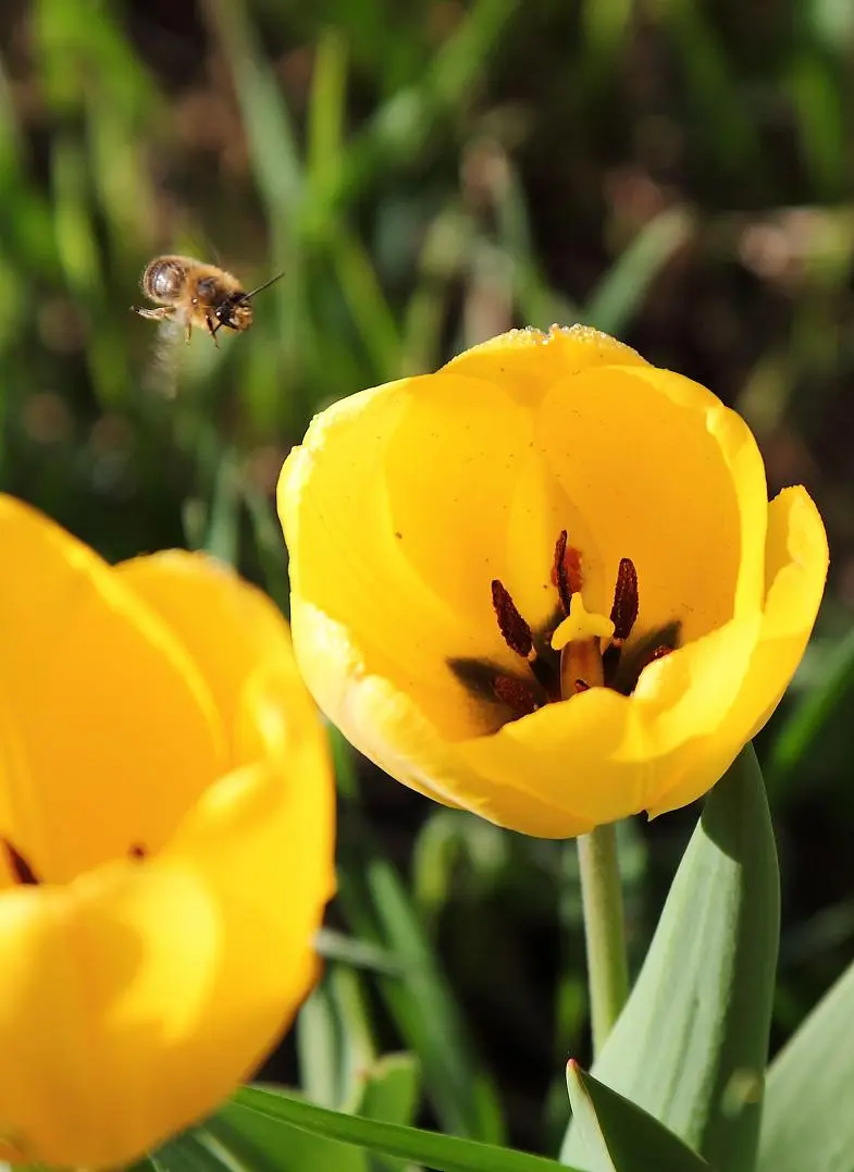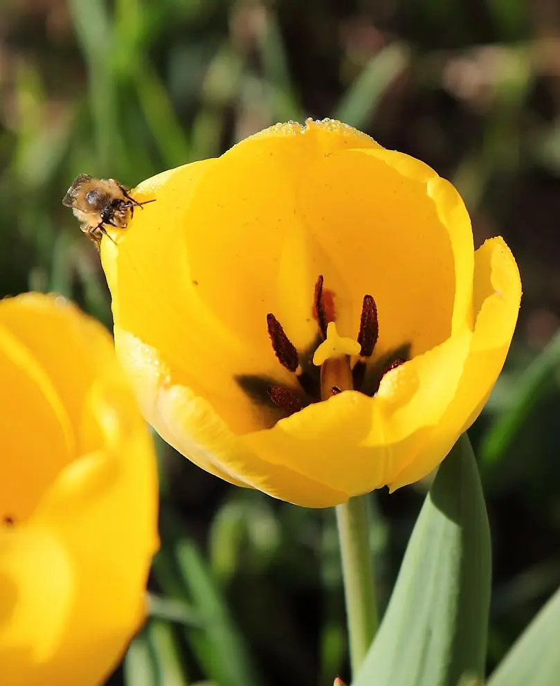 Tulpen in der Morgensonne, mit Tautropfen und Biene.