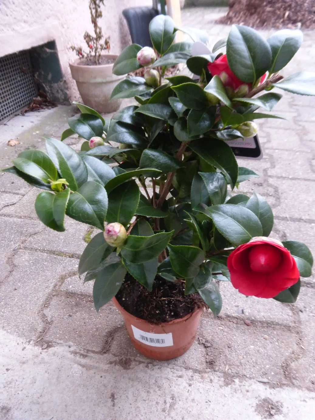 • Bin heute bei Netto schwach geworden, der hatte Kamelien, und ich hab mir eine rot gefüllte Camelia japonica 'Black Lace' mitgenommen. Zuhaus hab ich grade mal geschaut: Die kommt aus Italien, das ist wohl ein recht großer Züchter.