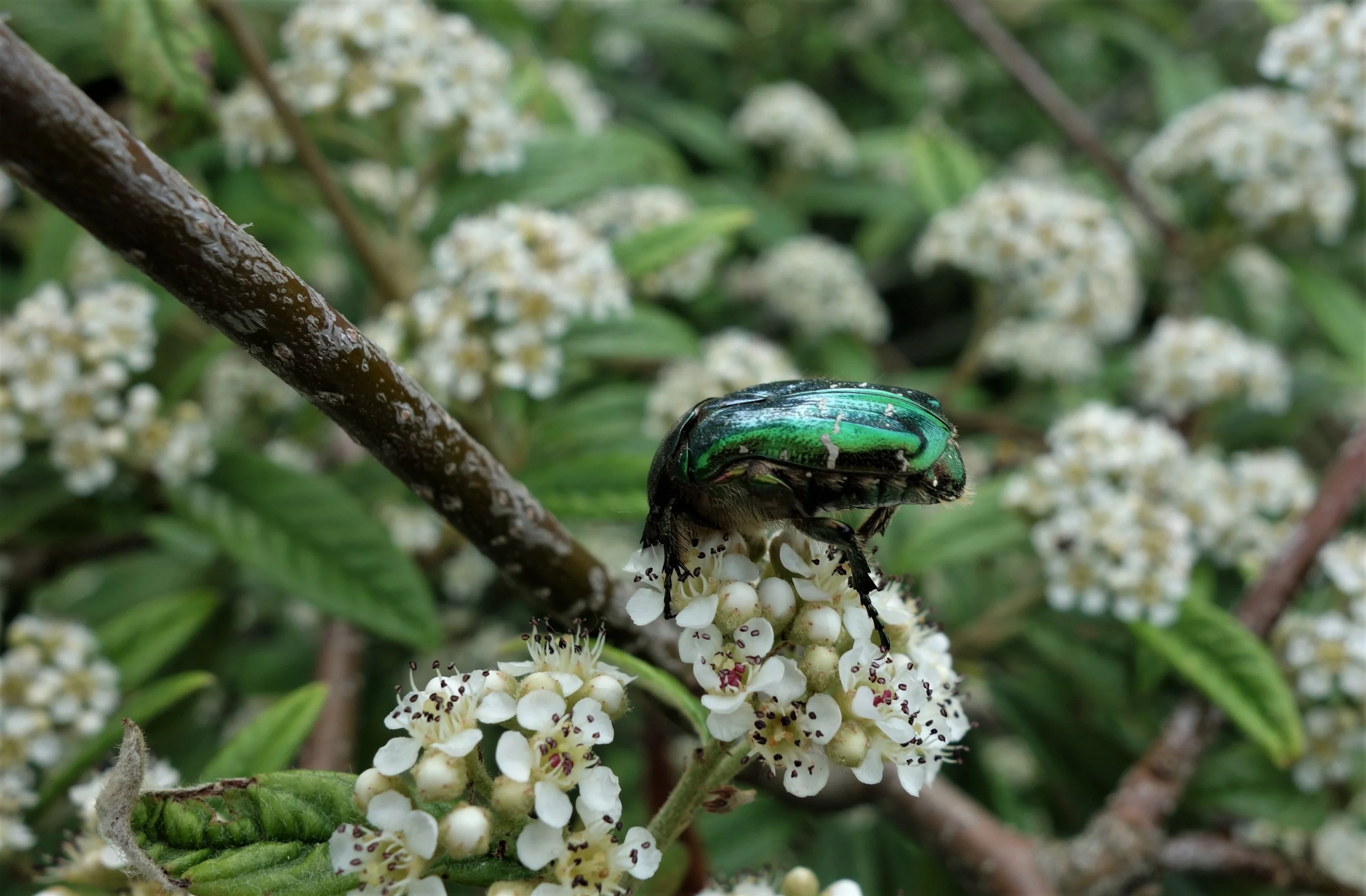 Hier blüht der raublättrige Schneeball und durchduftet die ganze Ostseite des Gartens, was vor allem die Insekten freut, die von dem Strauch nicht genug kriegen (genau wie ich ;)):