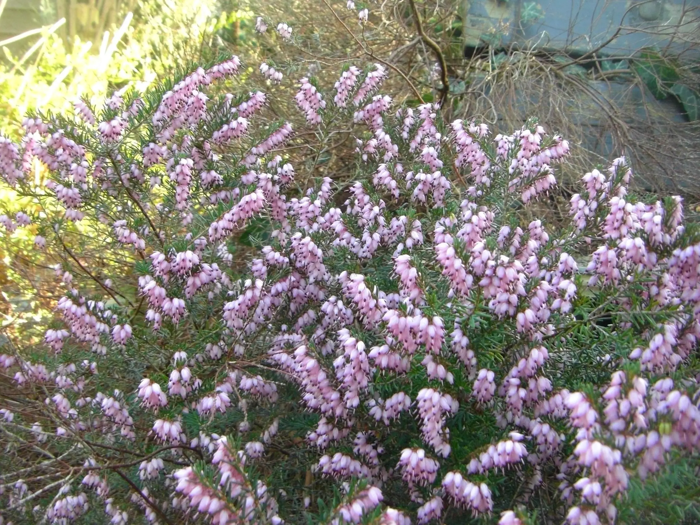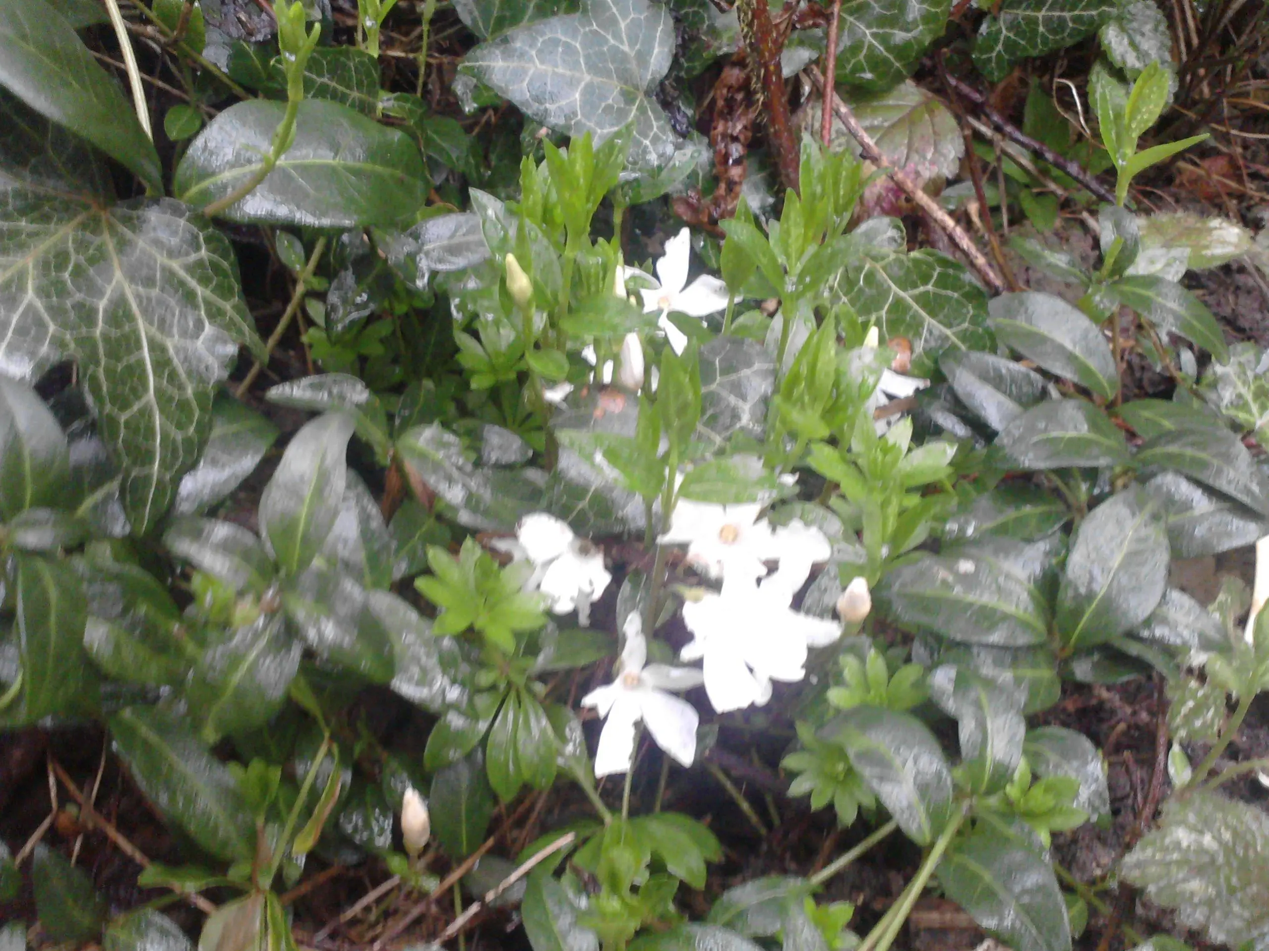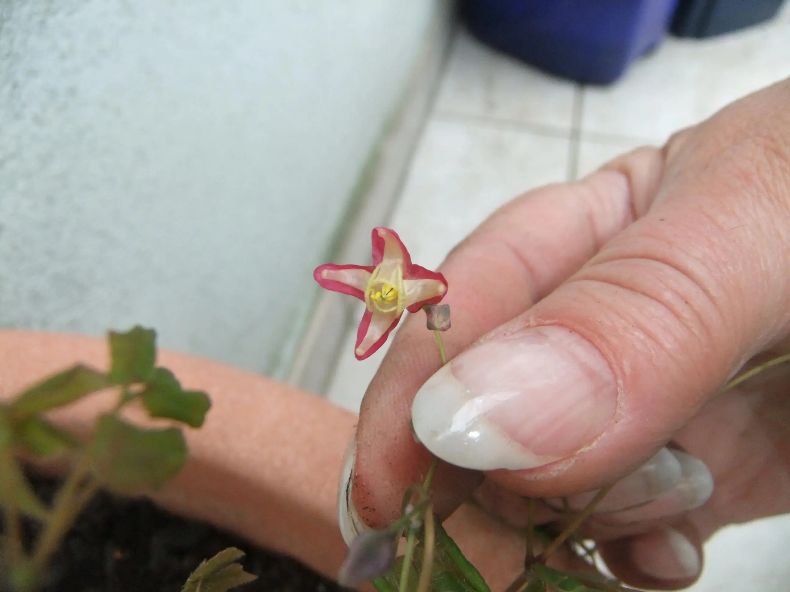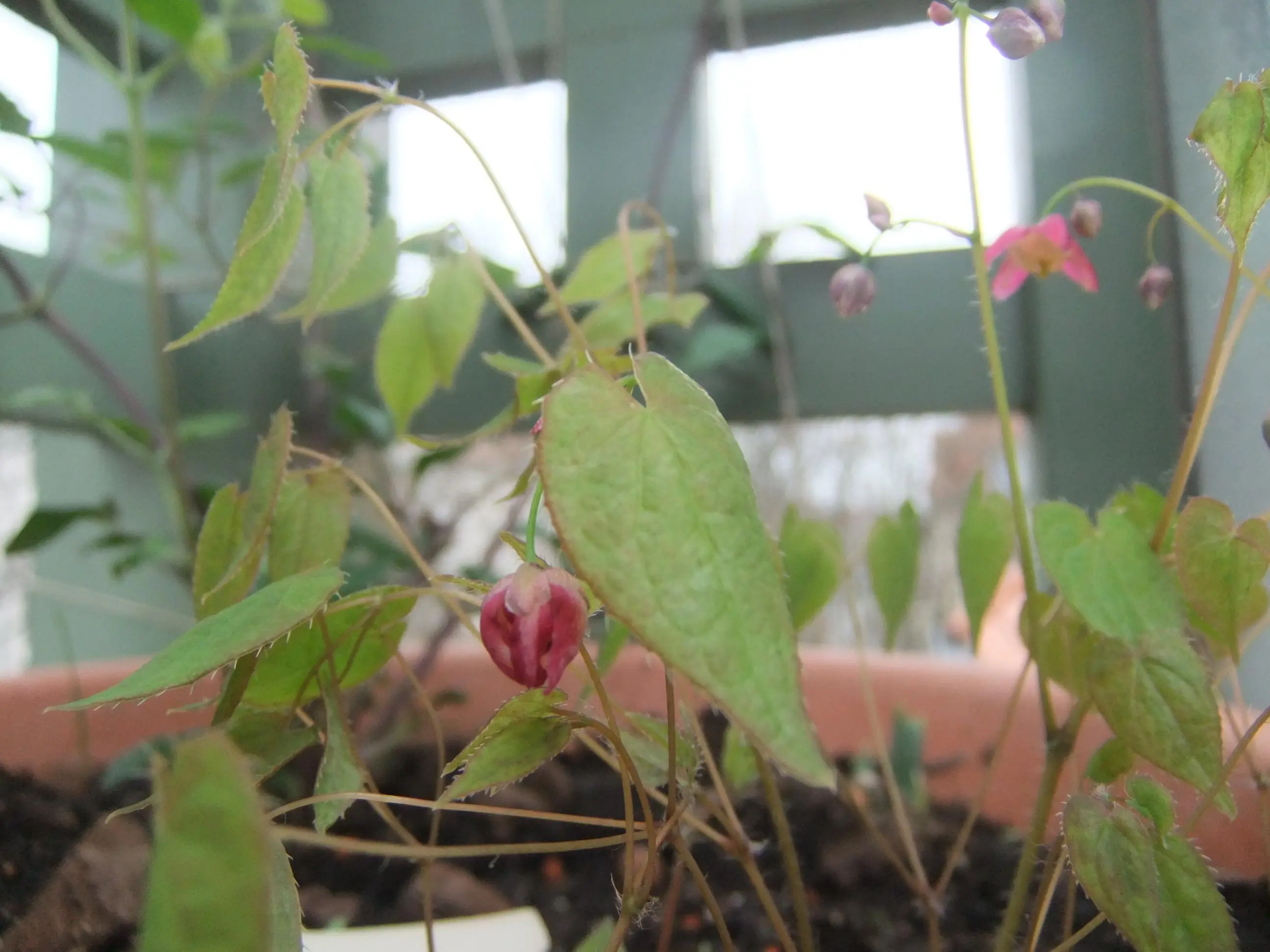 Und das blüht bei mir. Das ist Rote Elfenblume Epimedium x rubrum