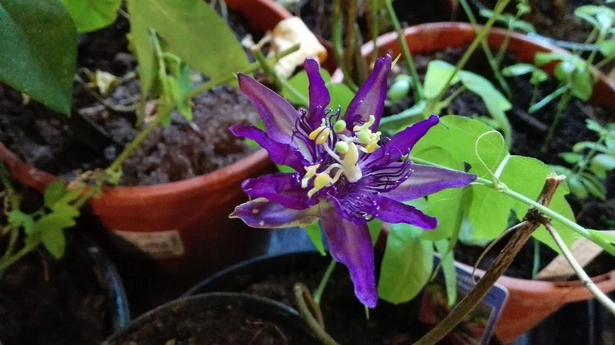Ein paar Passiflorae haben im Arbeitszimmer weitergeblüht, hier noch eine davon: