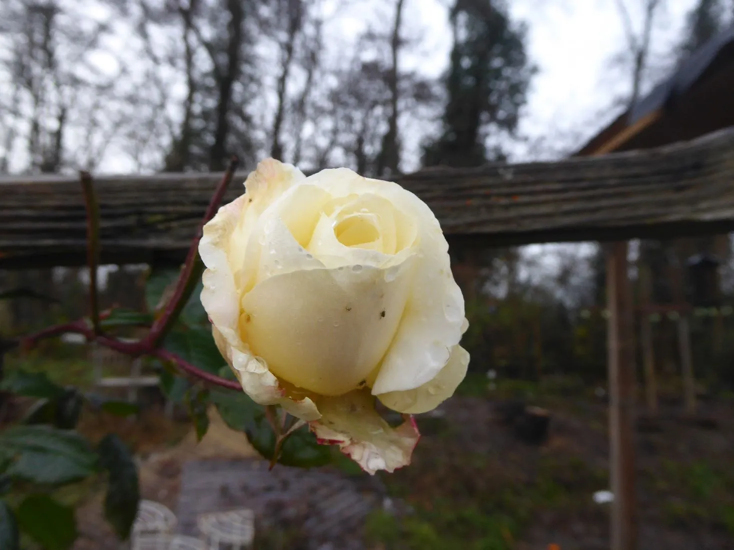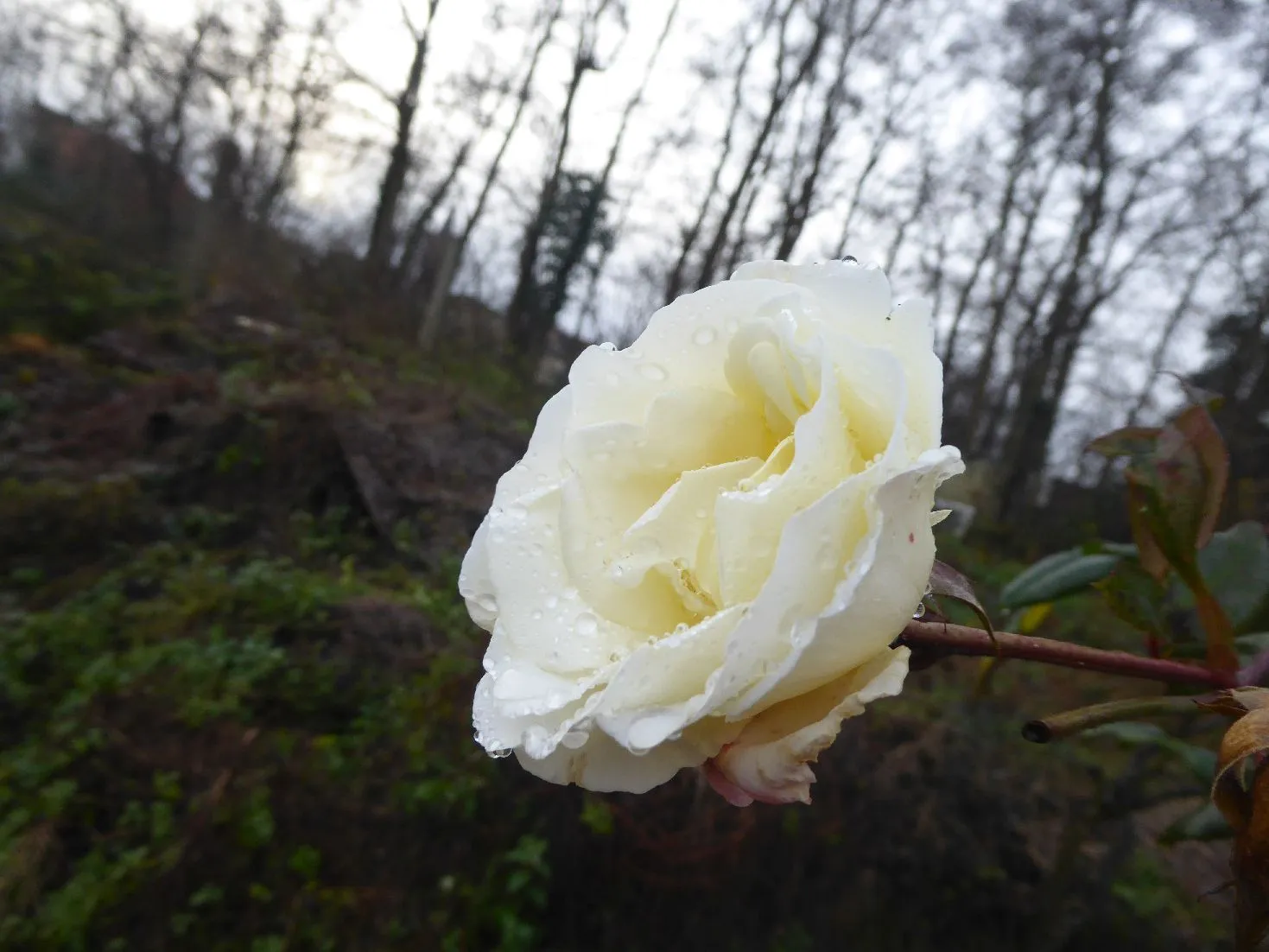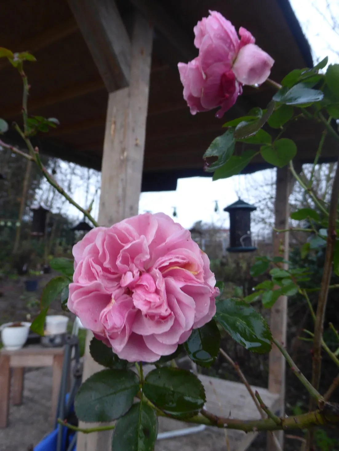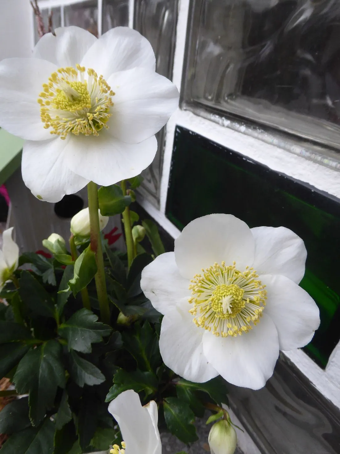Helleborus niger (neu gekauft) und Rosa Leonardo da Vinci, die schon den gesamten Winter über weiterblüht