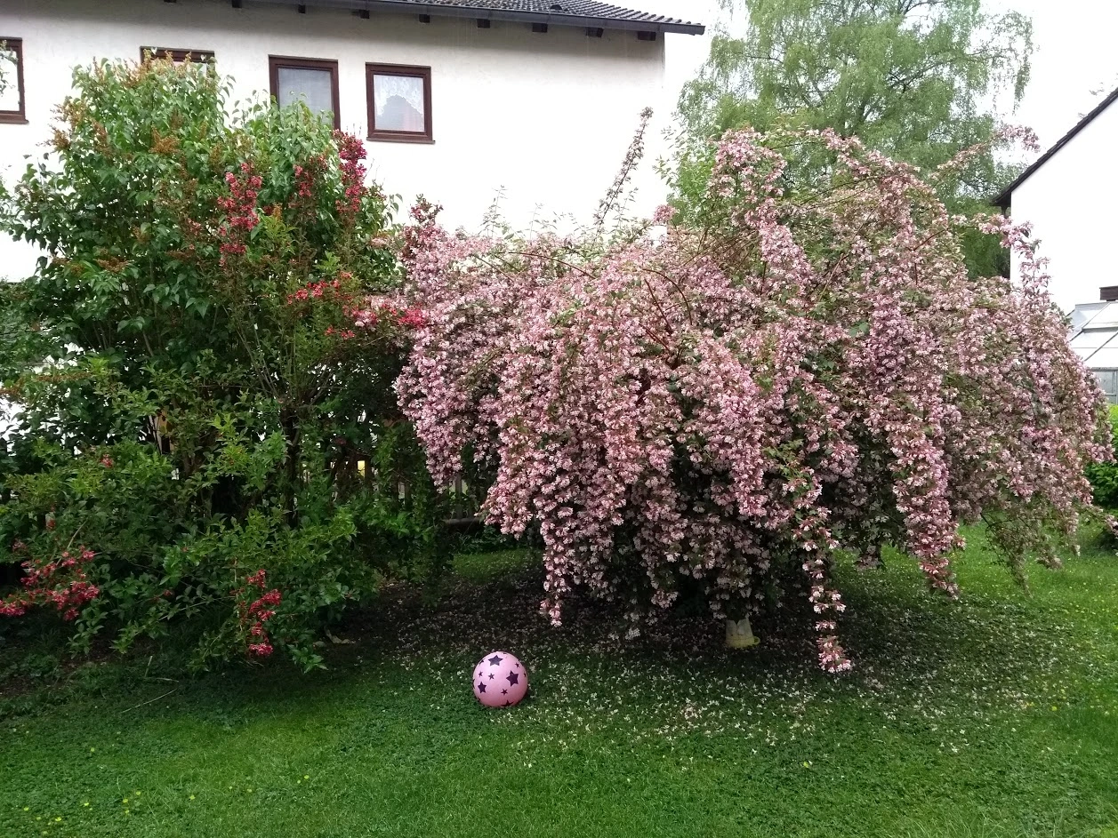 Kolkwitzie hat pünktlich gestern am 1. Mai die ersten Blüten geöffnet. Die nächsten Tage wird also 1 großeralter Strauch völlig übersät sein mit diesem zartfarbigen Luxus: