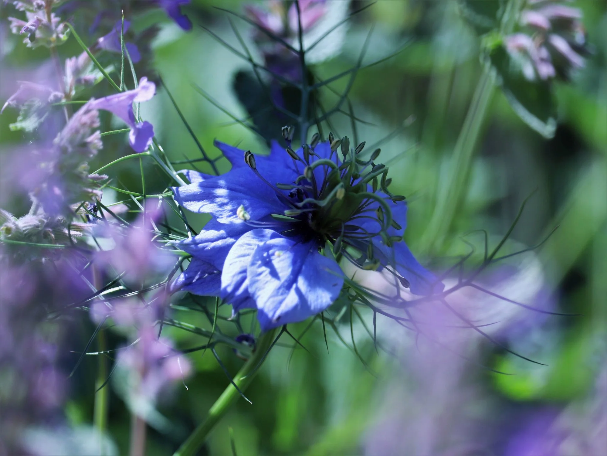 2020blmn92.webp Weiße Glockenblumen, Ziersalbei und Katzenminze. Im Hintergrund der traurigbraune Rasen ...