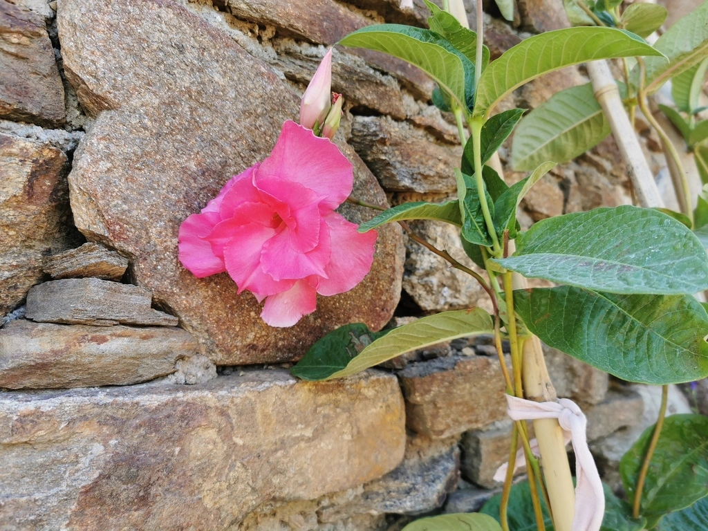 Nachdem nach vielen Vorarbeiten eine neue Mauer gebaut und auch teilweise schon gepflanzt wurde, erste blühten. Eine Mandevilla.