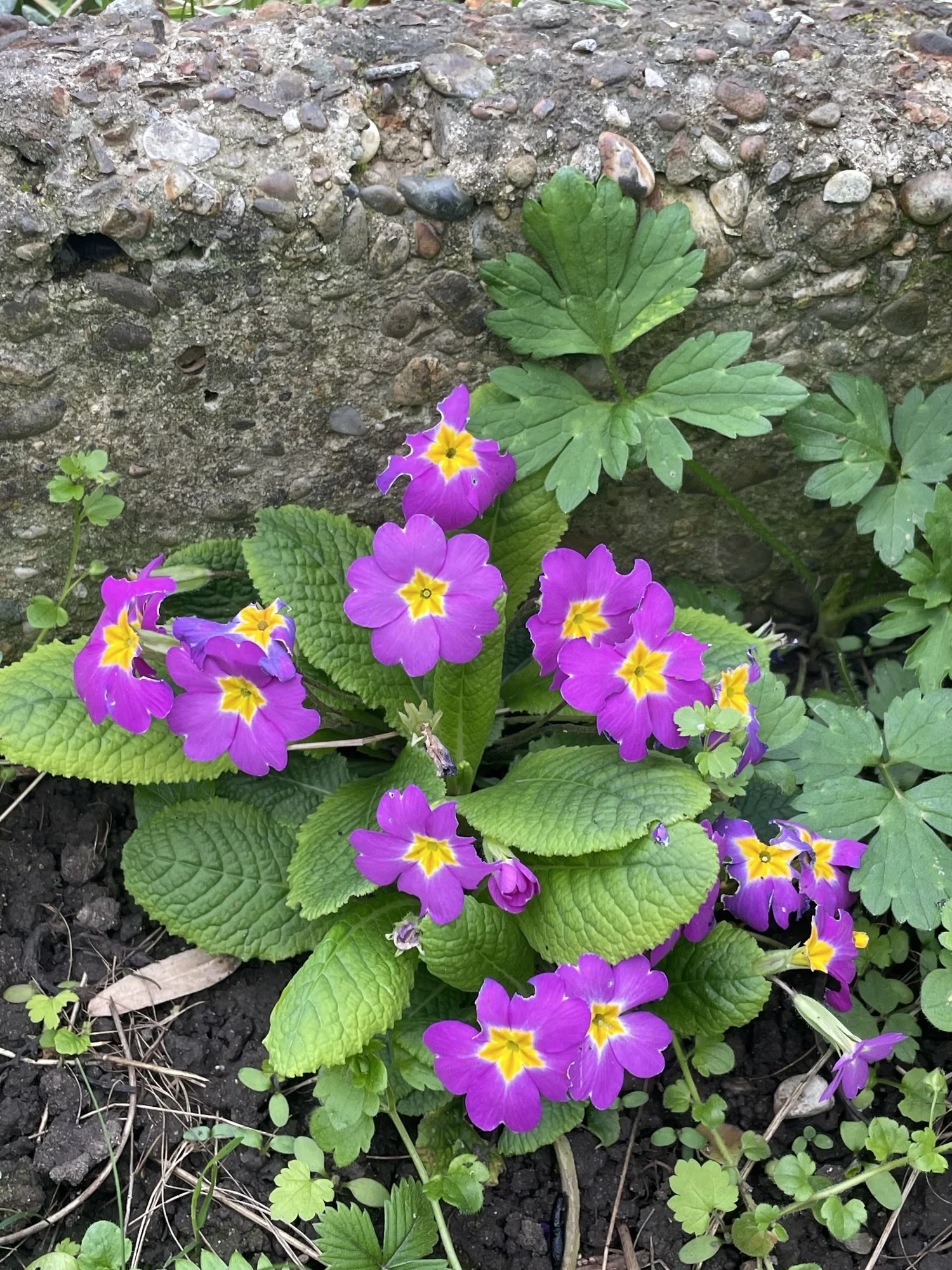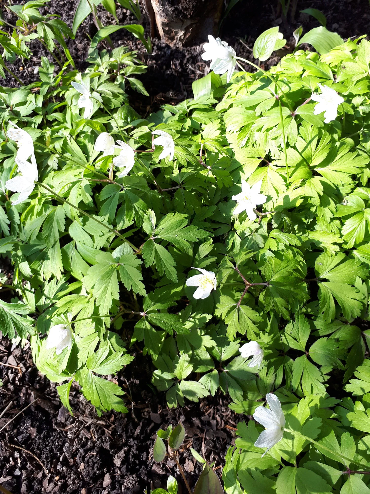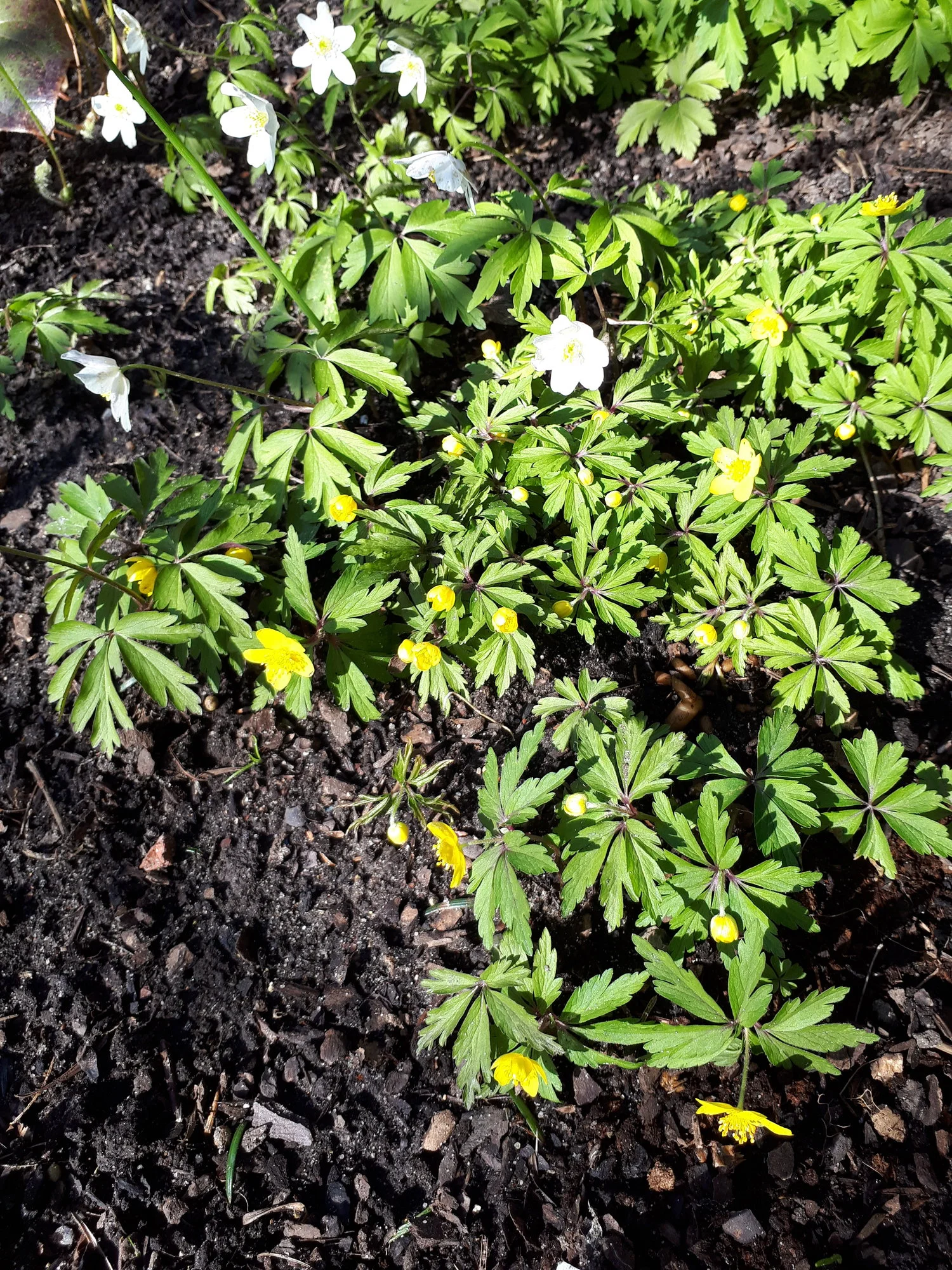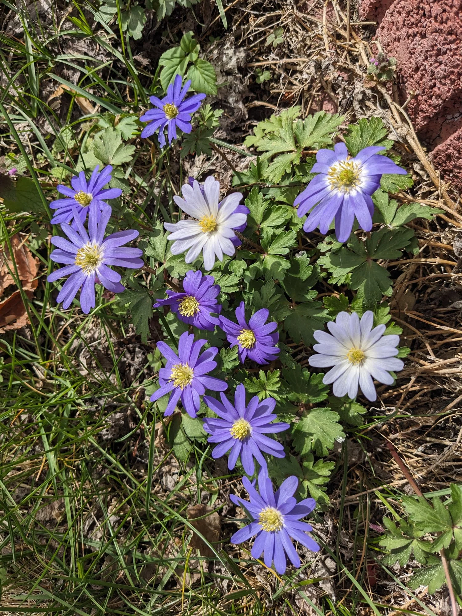 Diese Kronenanemone hat trotz Lagerung in trockener Erde im Herbst ausgetrieben, und so habe ich sie eingesetzt. Sie war den ganzen Winter grün, unbeeindruckt von –10 °C mit oder ohne Schnee, auch der viele Regen hat ihr nichts ausgemacht, die Erde ist nicht mal sonderlich durchlässig und sonnig ist es da auch noch nicht. Sollte angeblich gar nicht möglich sein .. ..