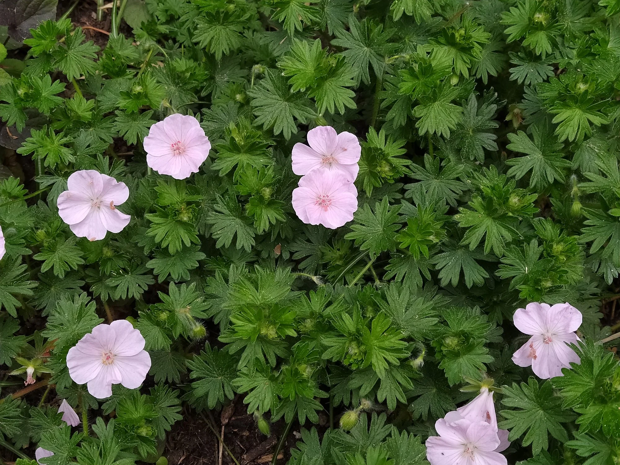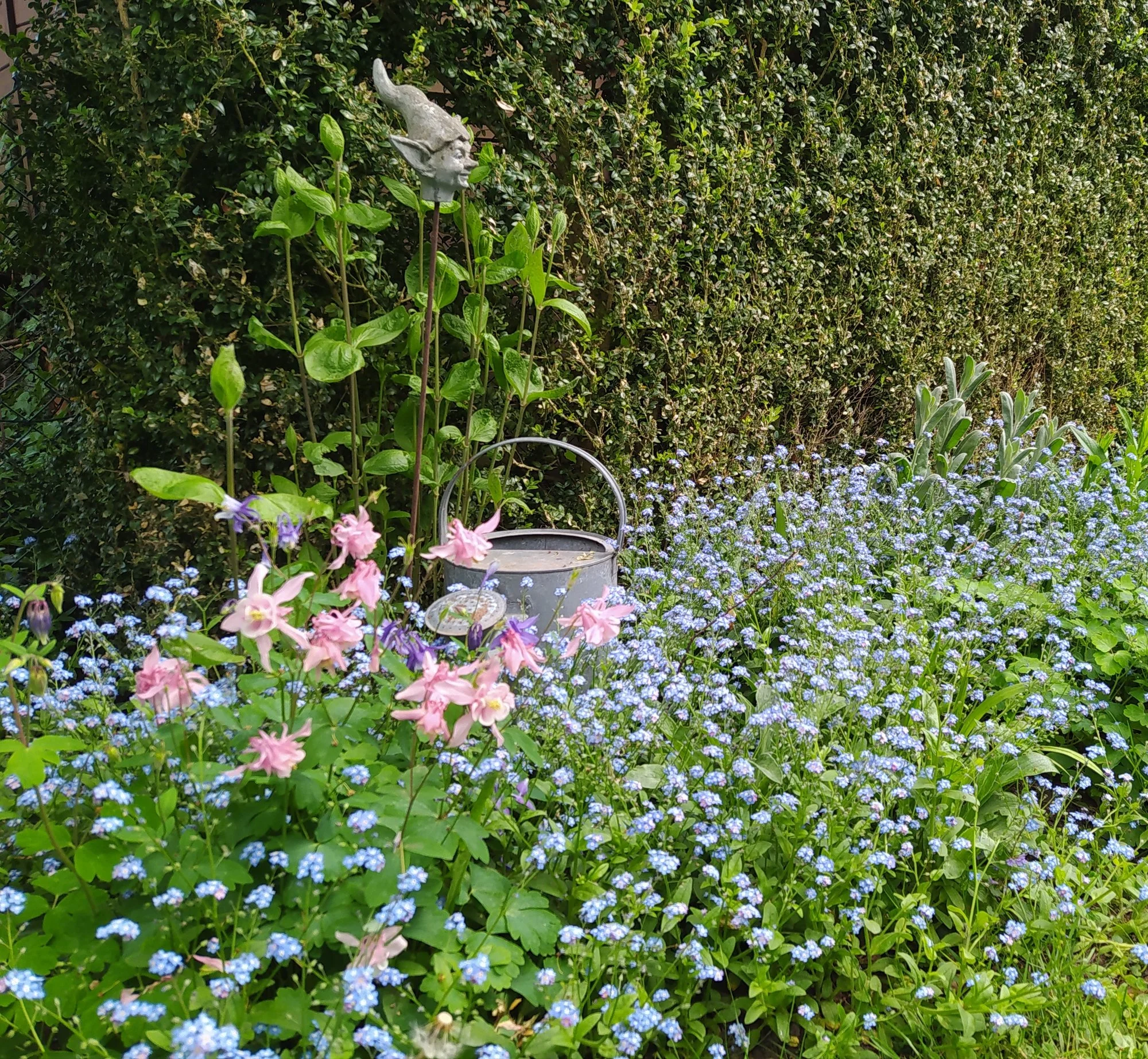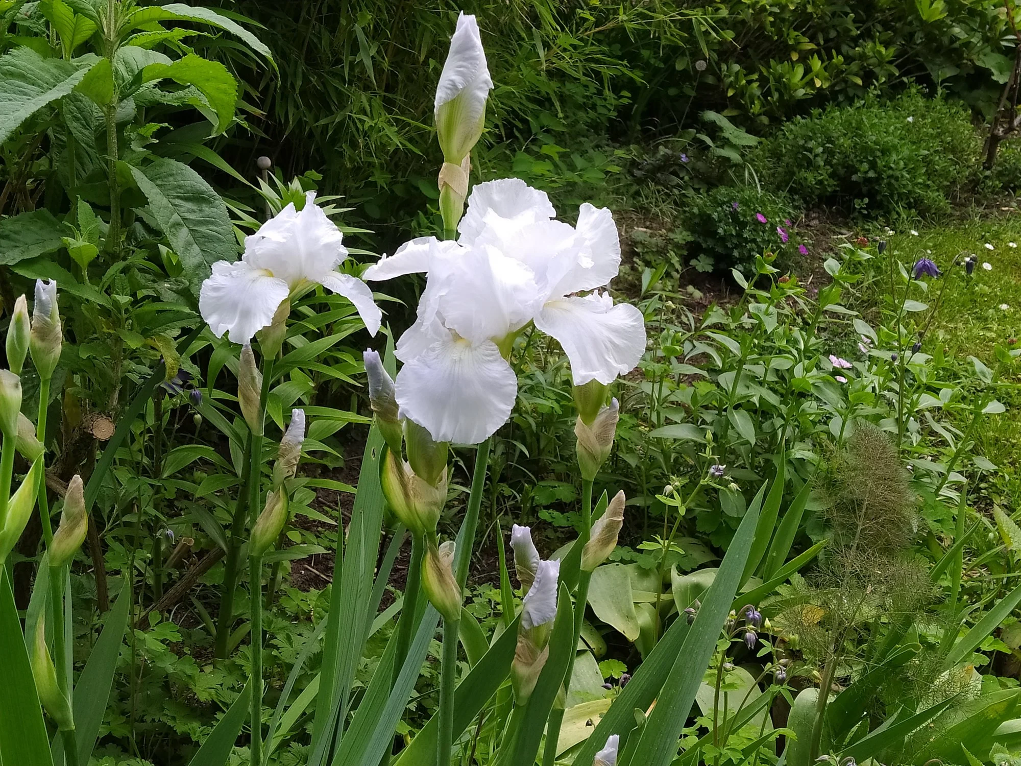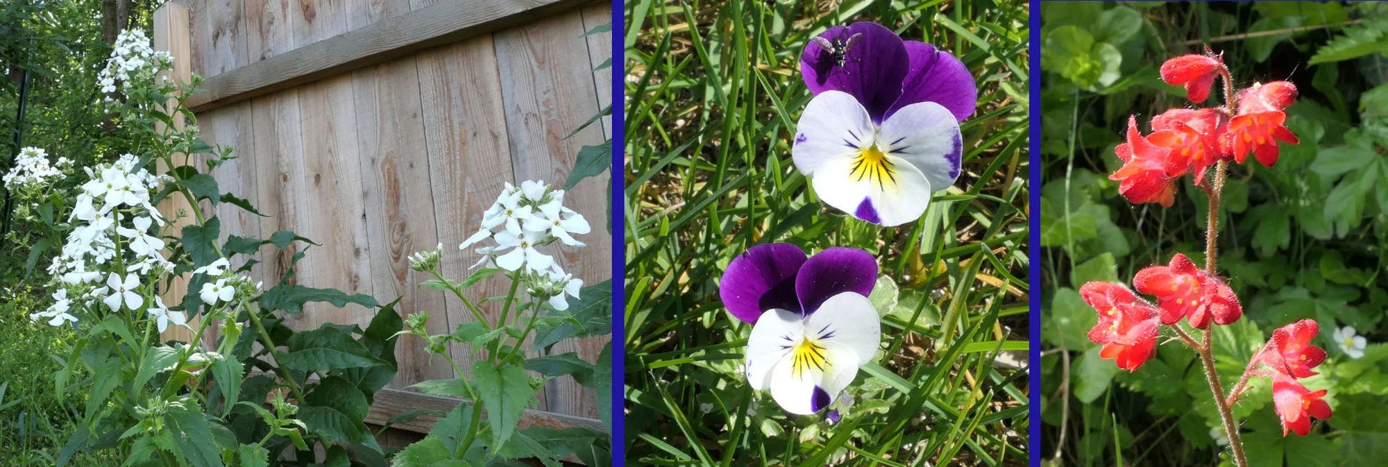 Heuer groß gewordene weiße Nachtviole Hesperis matronalis, ein überraschend im Rasen aufgetauchtes Hornveilchen und eine vom mehreren Blütenständen von Heuchera sanguinea 'Leuchtkäfer', die sich an einem schattigen Platz recht gut hält. Campanula portenschlagiana heute noch schön, morgen sicher vom Regen niedergedrückt. Geranium macrorrhizum 'Olympos', ein nur 20 cm hoch werdender Bodendecker