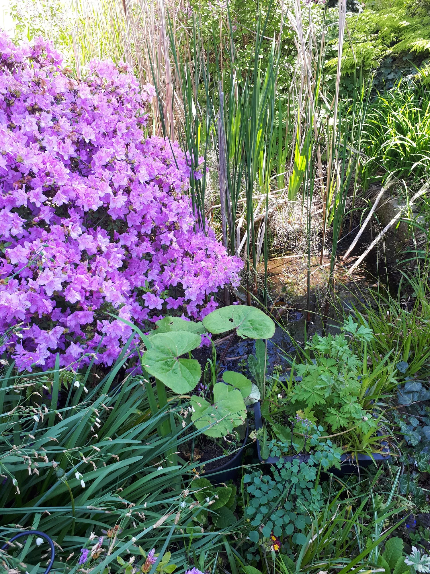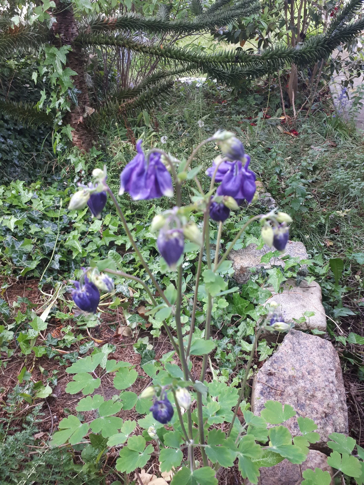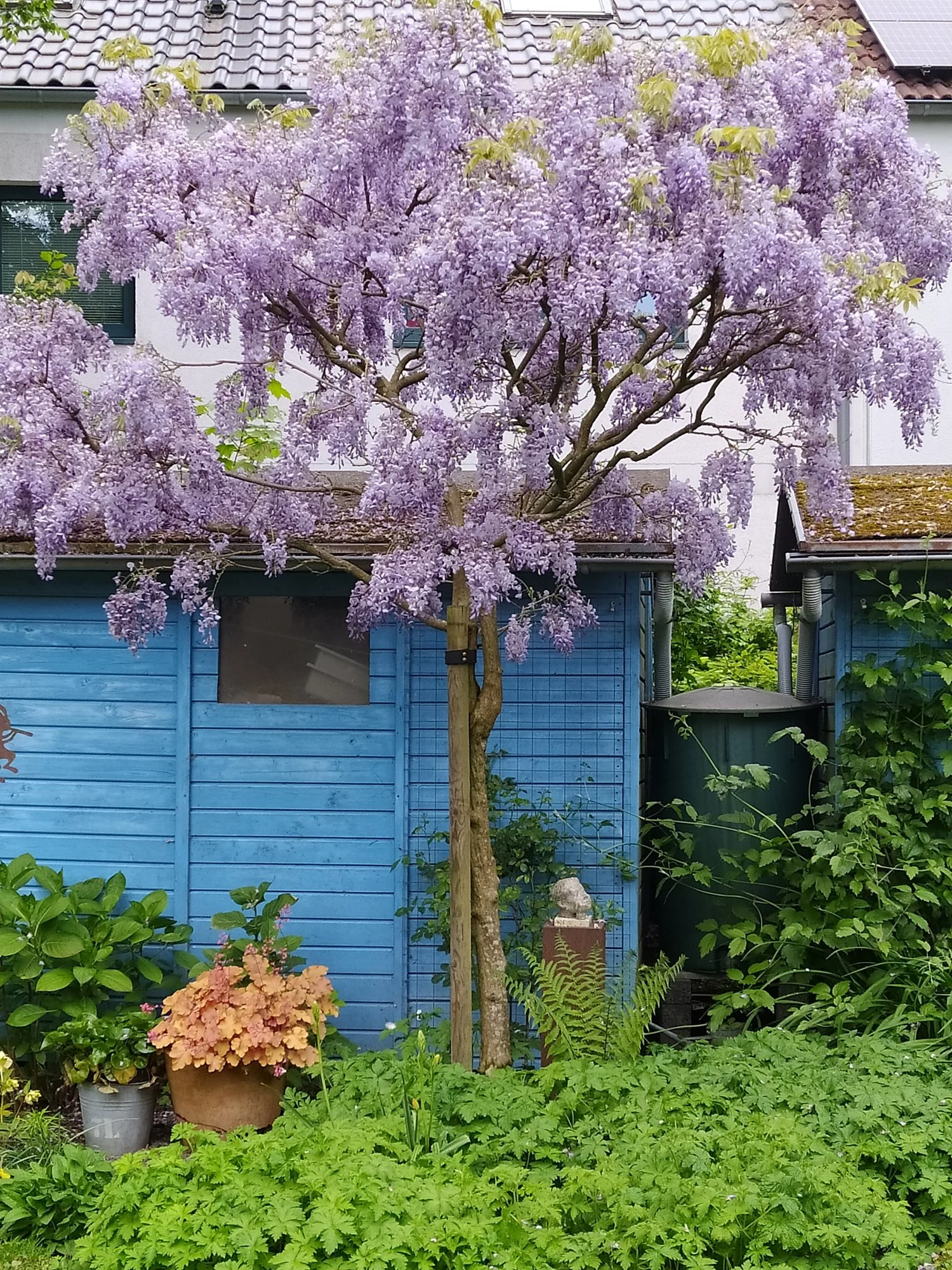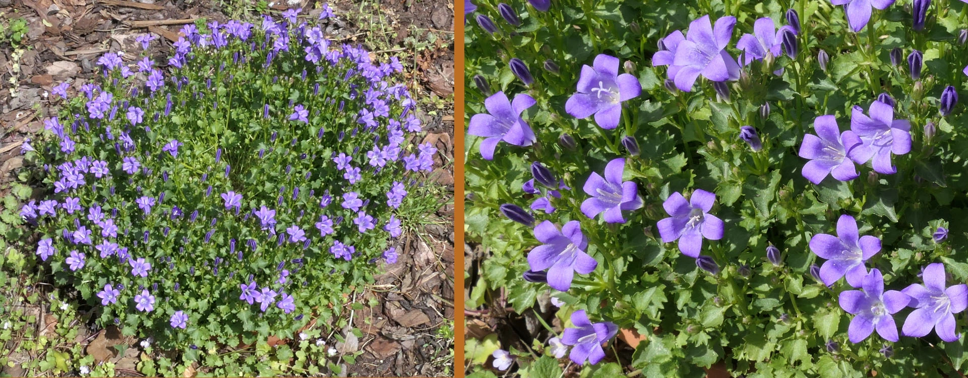 Heuer groß gewordene weiße Nachtviole Hesperis matronalis, ein überraschend im Rasen aufgetauchtes Hornveilchen und eine vom mehreren Blütenständen von Heuchera sanguinea 'Leuchtkäfer', die sich an einem schattigen Platz recht gut hält. Campanula portenschlagiana heute noch schön, morgen sicher vom Regen niedergedrückt. Geranium macrorrhizum 'Olympos', ein nur 20 cm hoch werdender Bodendecker