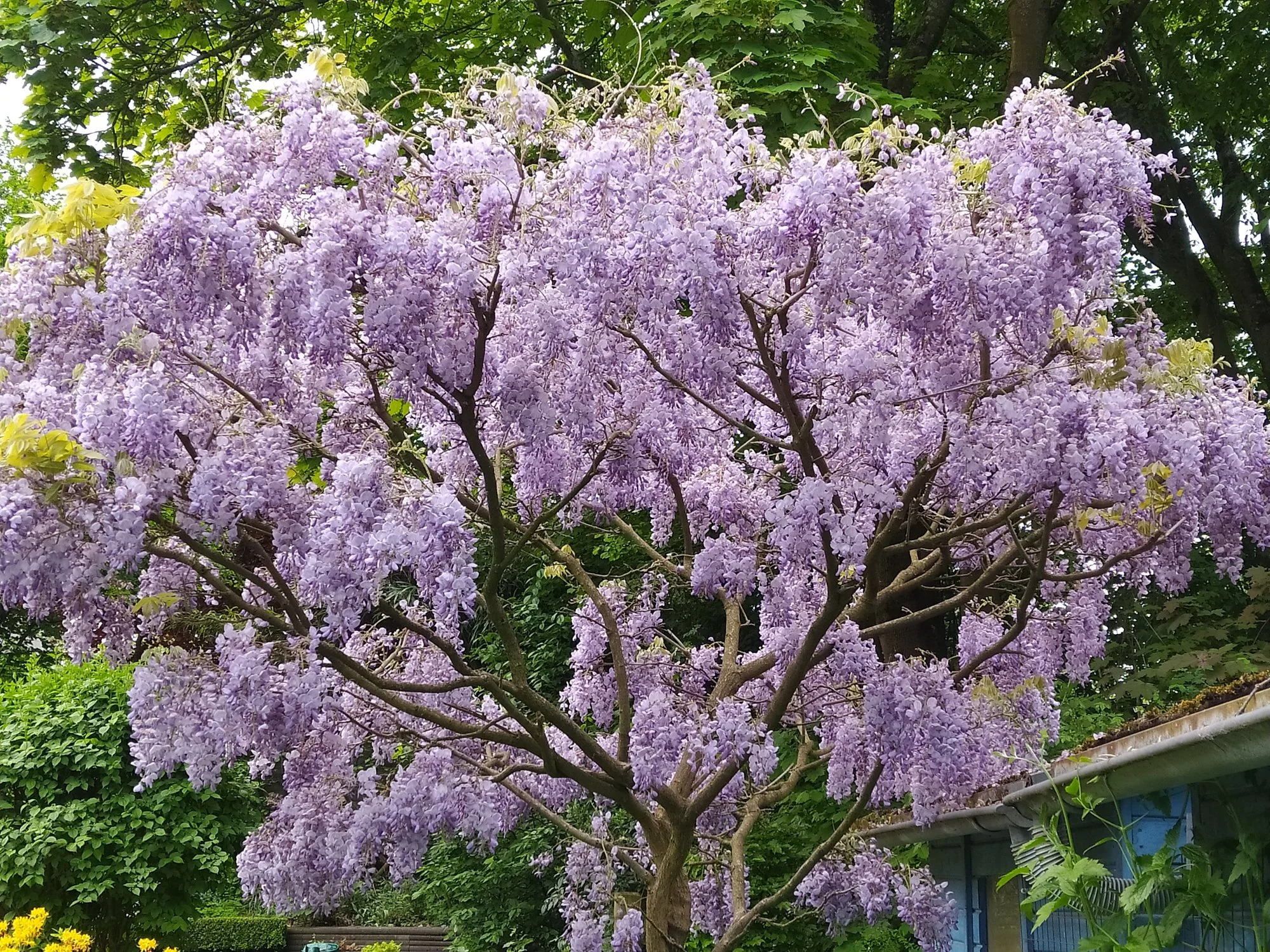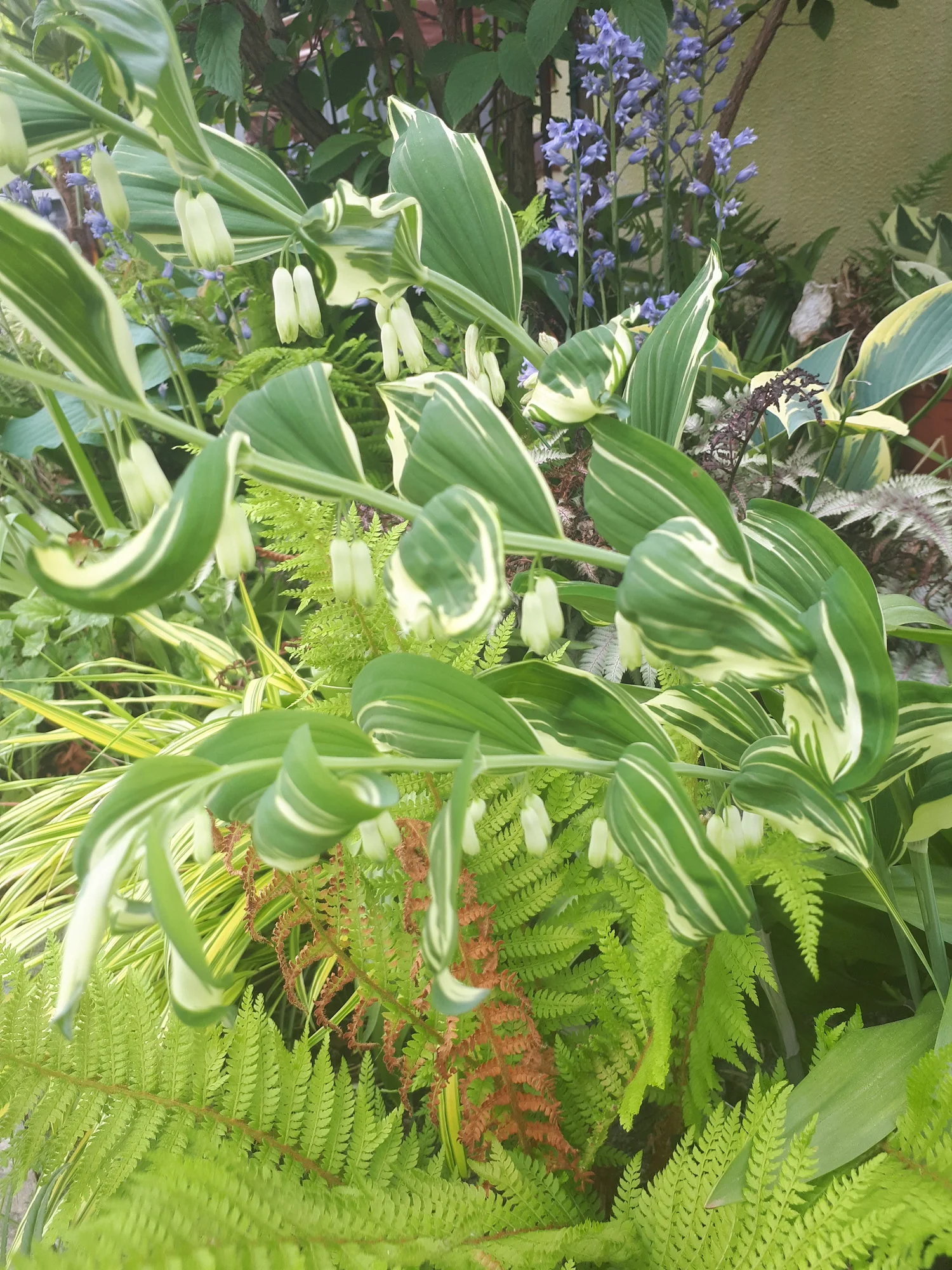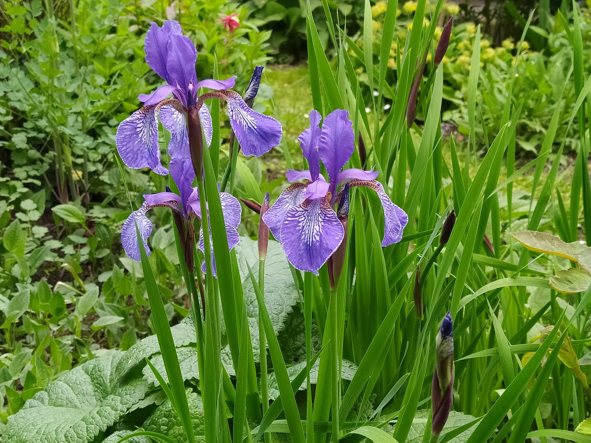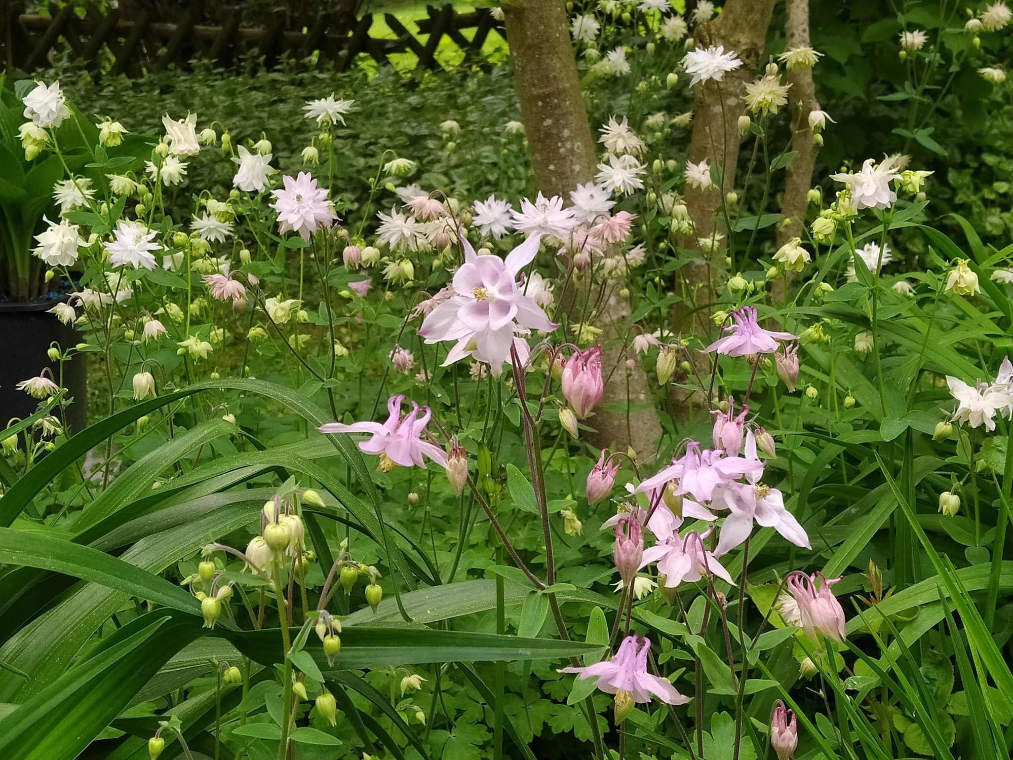 Heuer groß gewordene weiße Nachtviole Hesperis matronalis, ein überraschend im Rasen aufgetauchtes Hornveilchen und eine vom mehreren Blütenständen von Heuchera sanguinea 'Leuchtkäfer', die sich an einem schattigen Platz recht gut hält. Campanula portenschlagiana heute noch schön, morgen sicher vom Regen niedergedrückt. Geranium macrorrhizum 'Olympos', ein nur 20 cm hoch werdender Bodendecker
