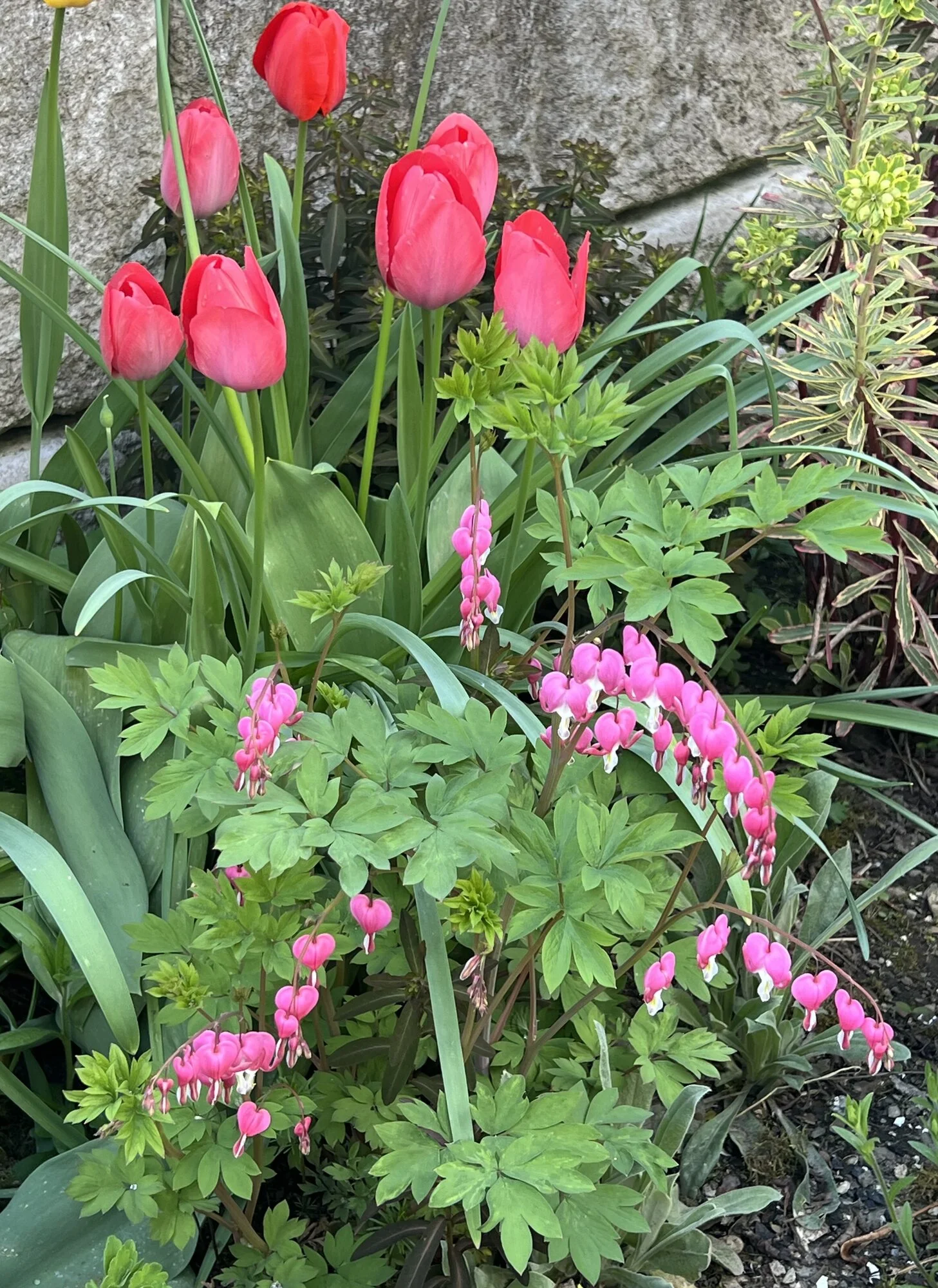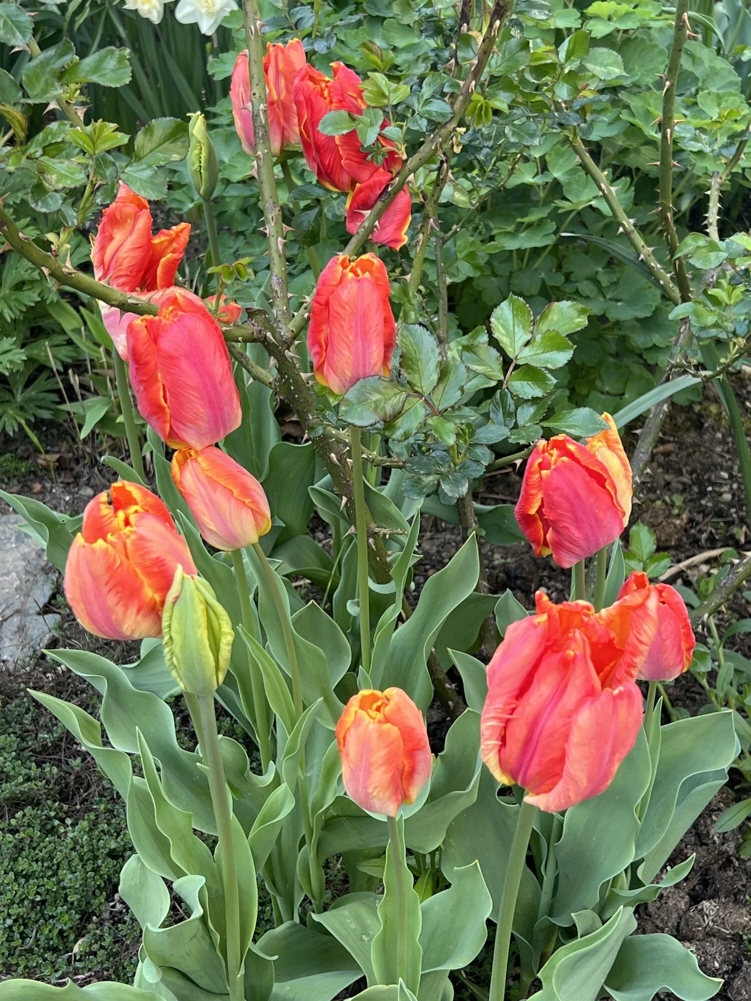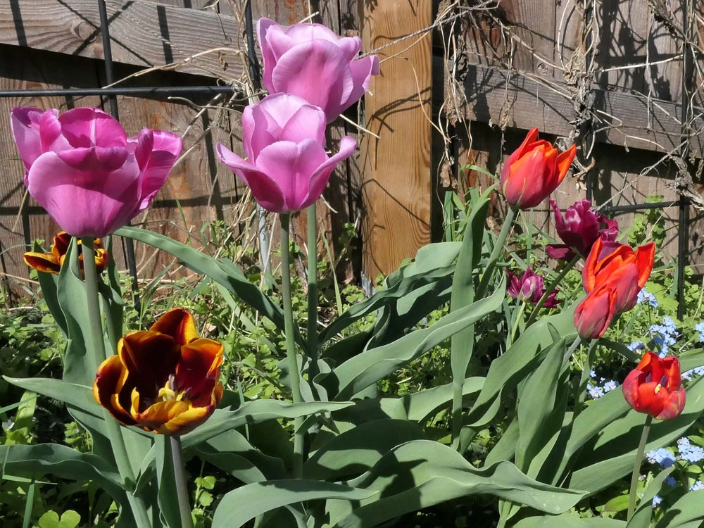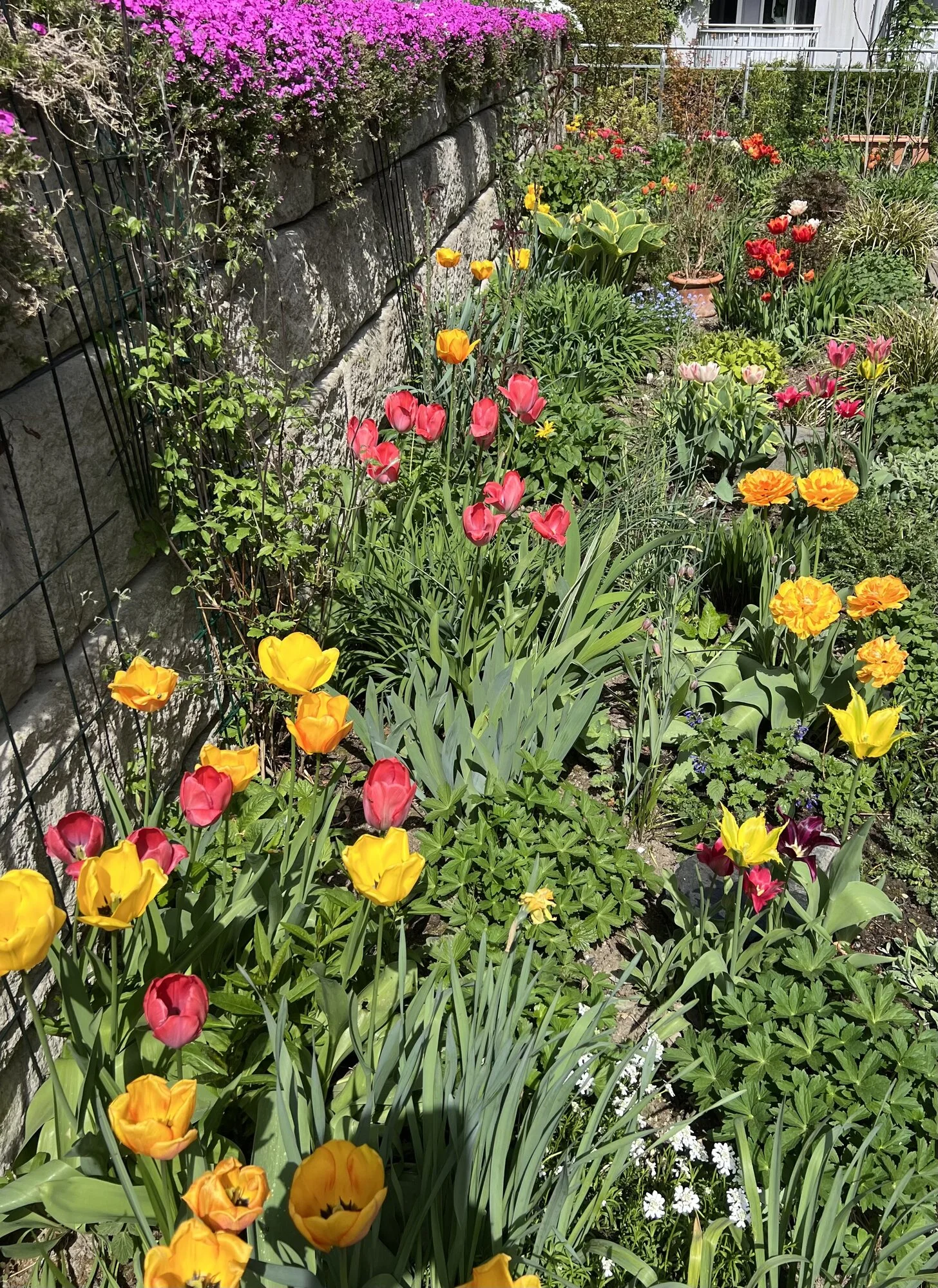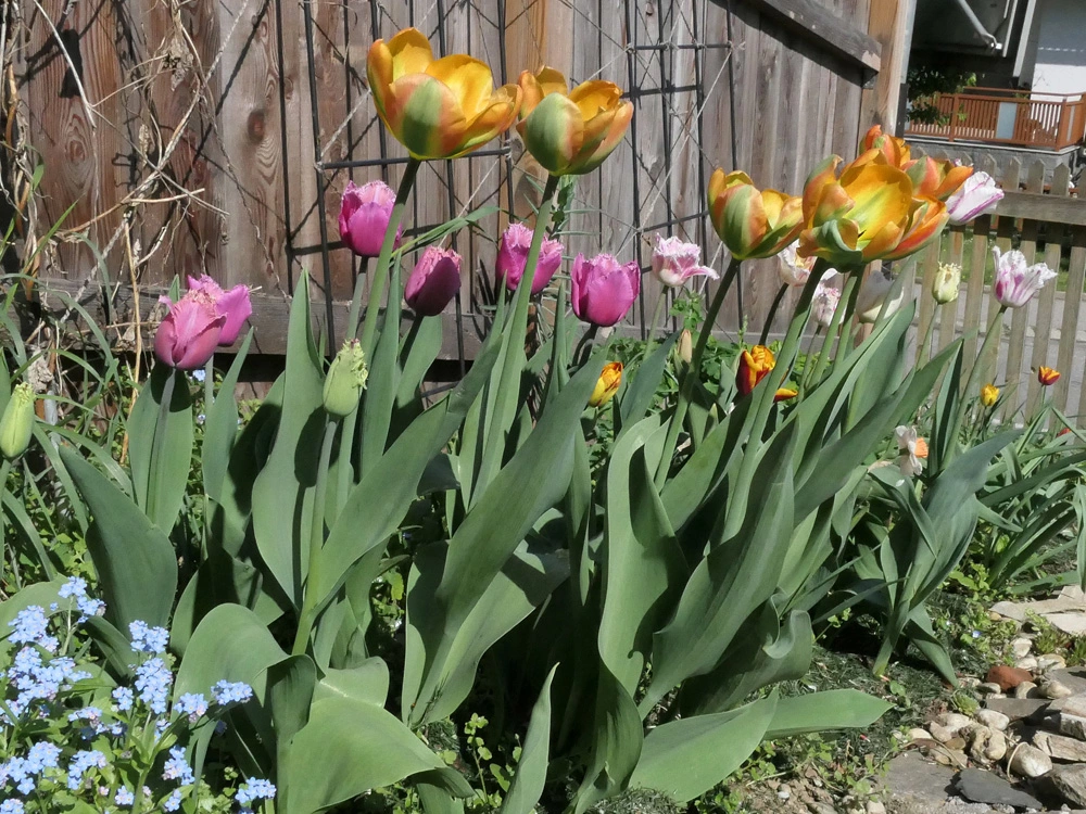 Narzisse 'Bridal Crown', Muscari 'Baby Breath', Mondviole und Flieder. Die April-, die mittleren und die Mai-Tulpen gleichzeitig, begonnen haben sie mit nur zwei oder drei Tagen Unterschied. Die frühesten sind innerhalb weniger Tage verblüht und somit vorbei, die ganz späten werden nicht mehr lange brauchen.