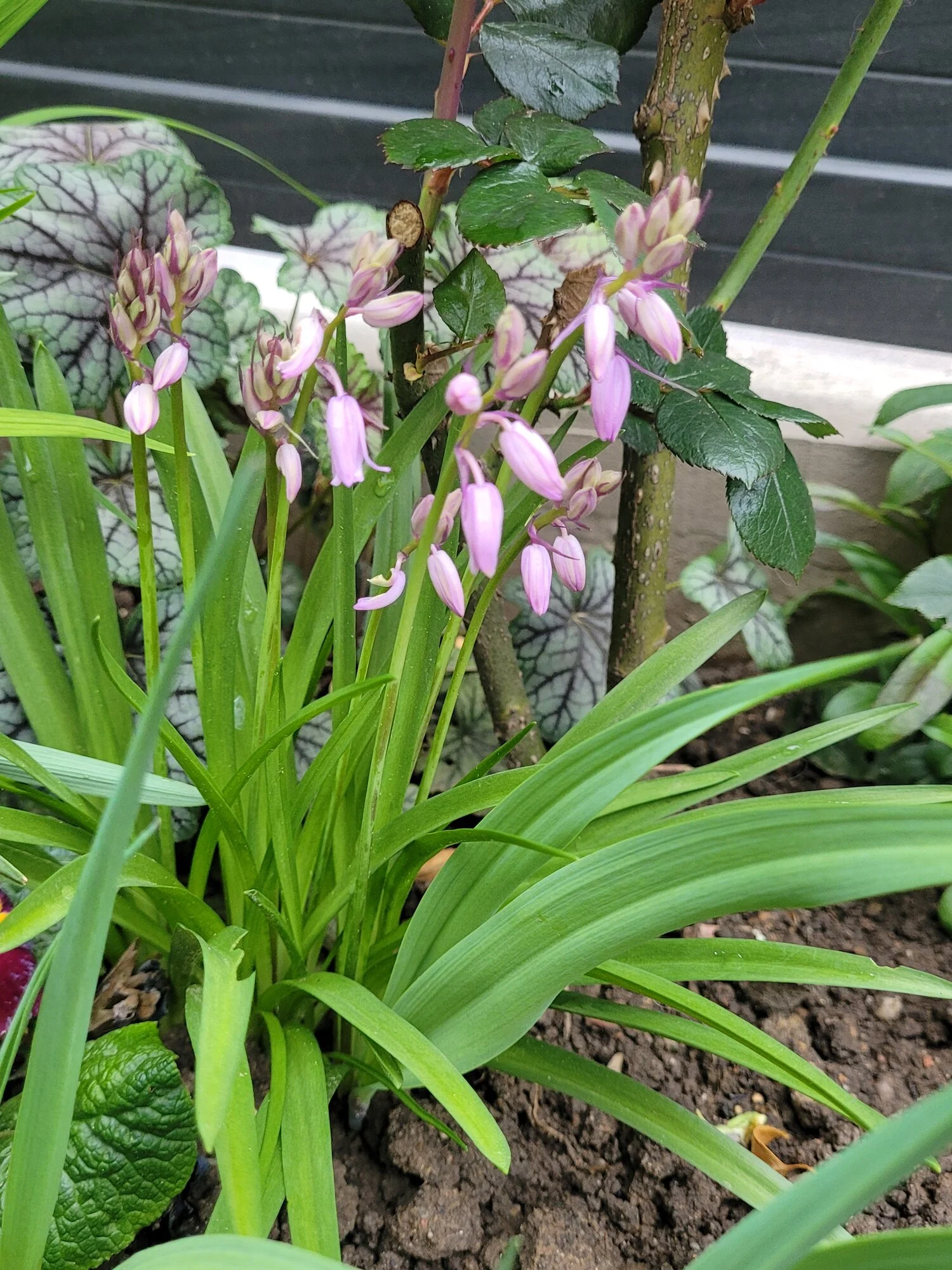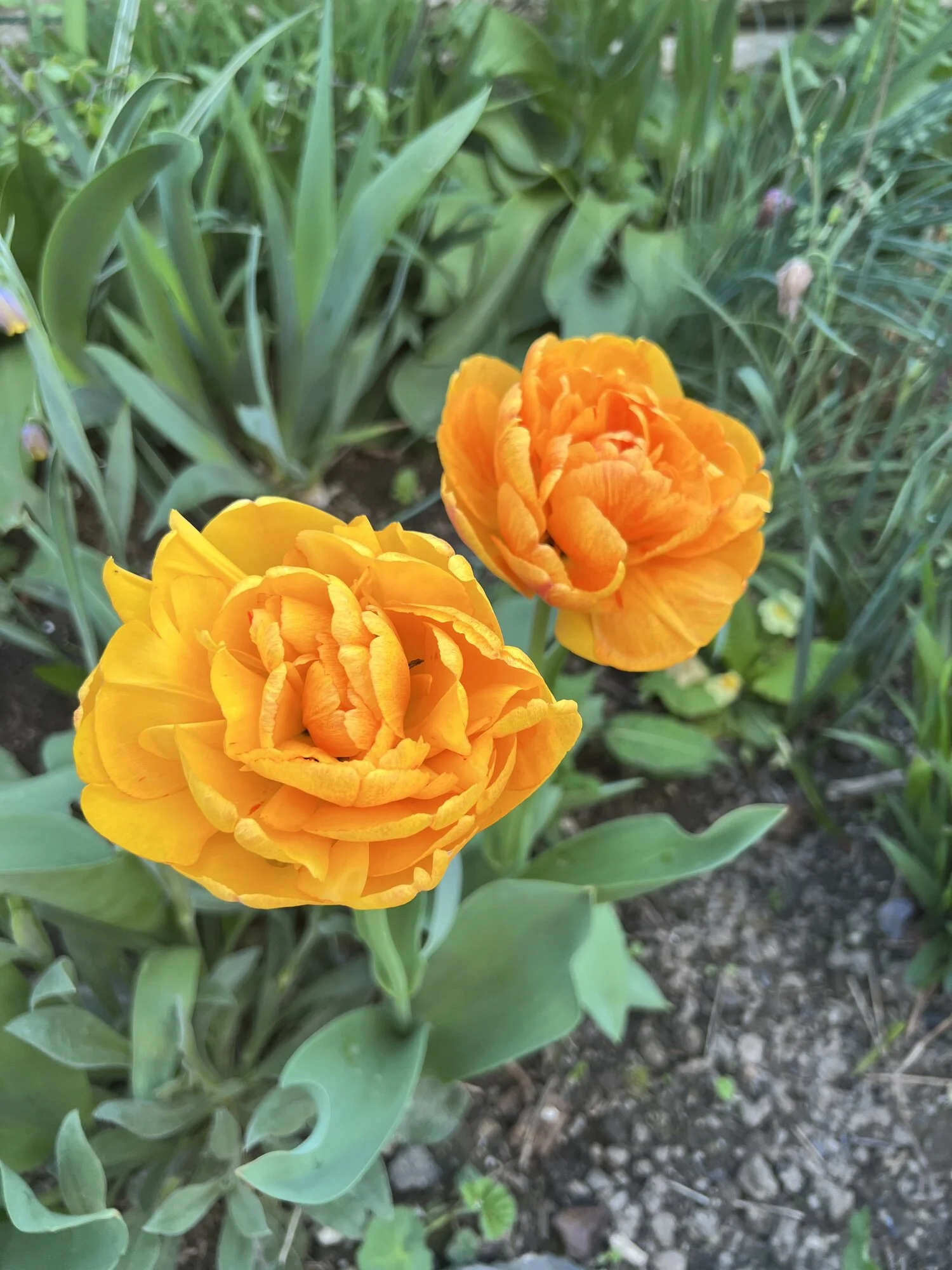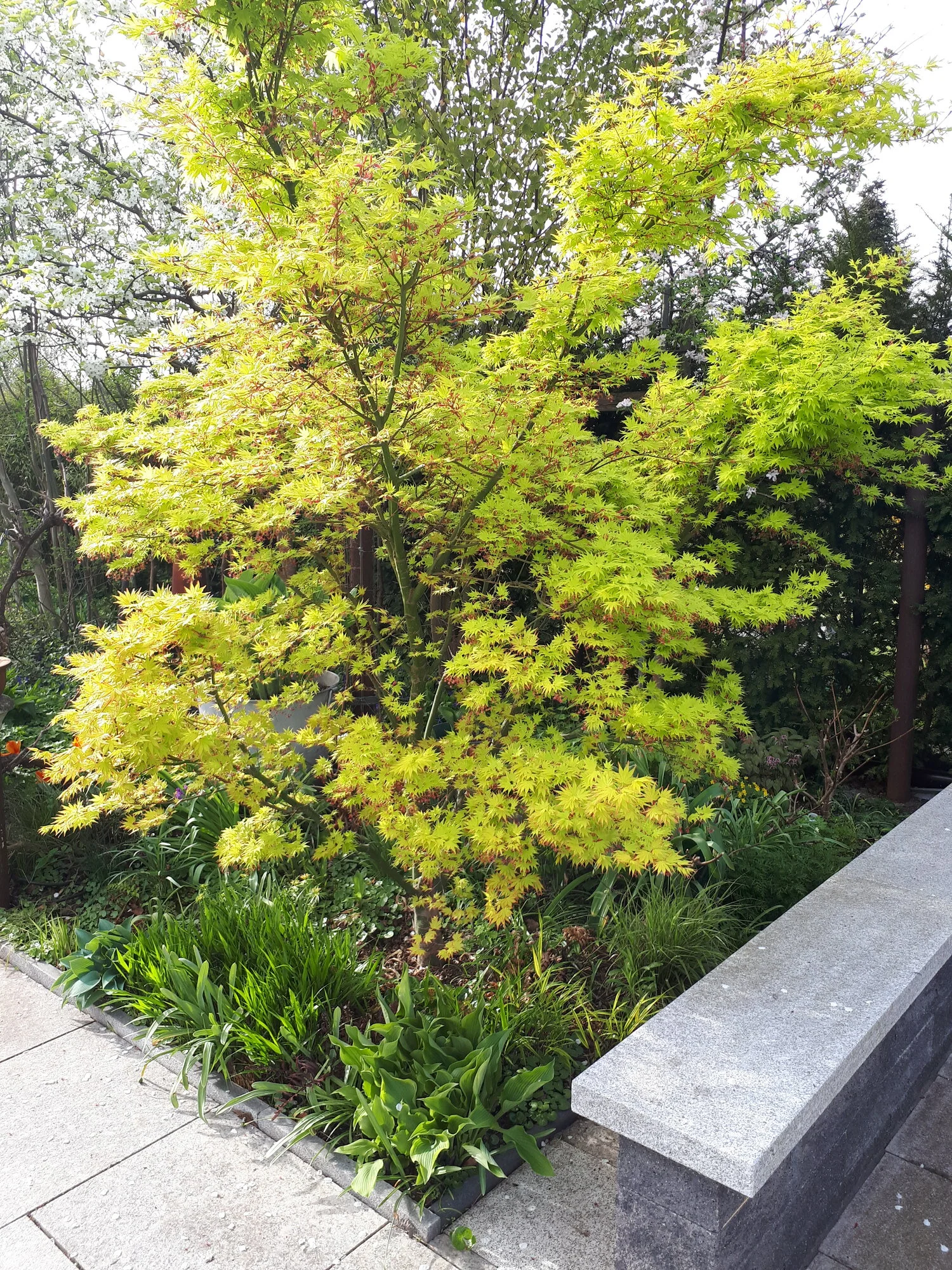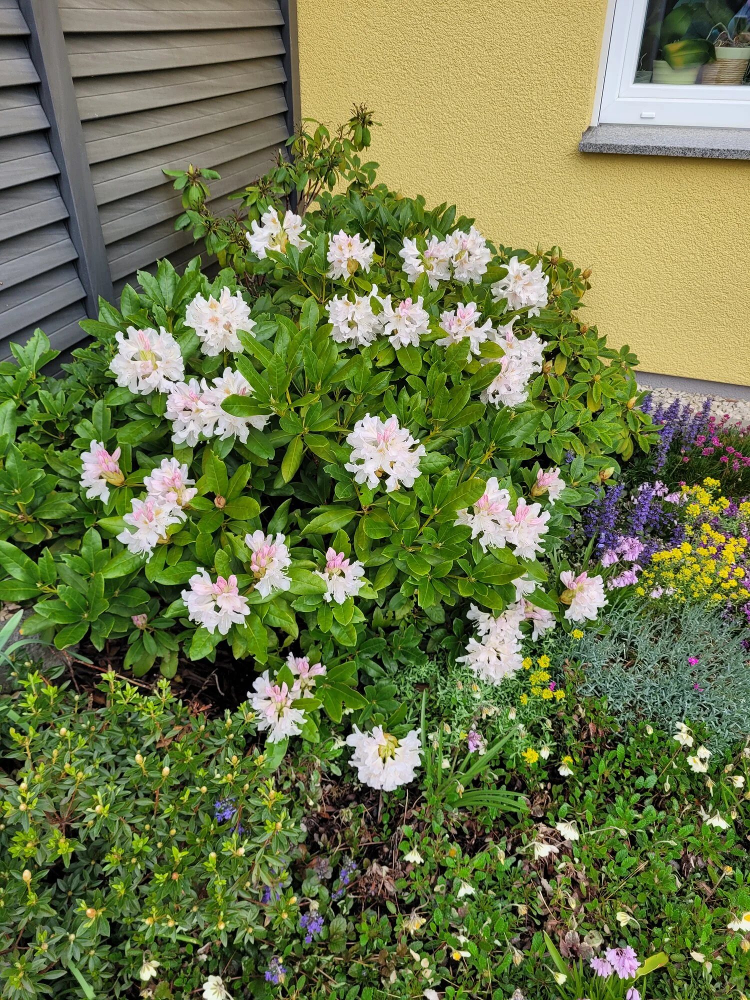 Narzisse 'Bridal Crown', Muscari 'Baby Breath', Mondviole und Flieder. Die April-, die mittleren und die Mai-Tulpen gleichzeitig, begonnen haben sie mit nur zwei oder drei Tagen Unterschied. Die frühesten sind innerhalb weniger Tage verblüht und somit vorbei, die ganz späten werden nicht mehr lange brauchen.