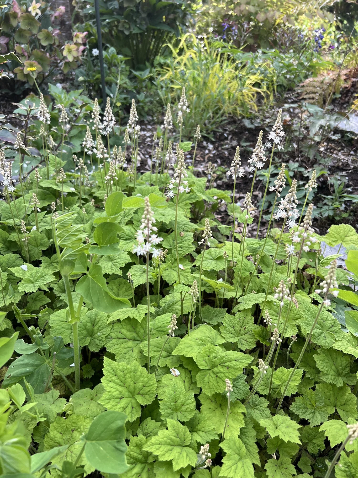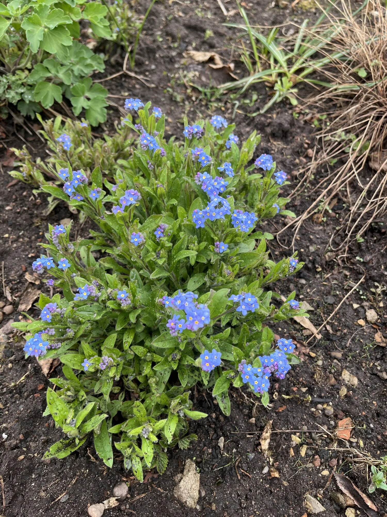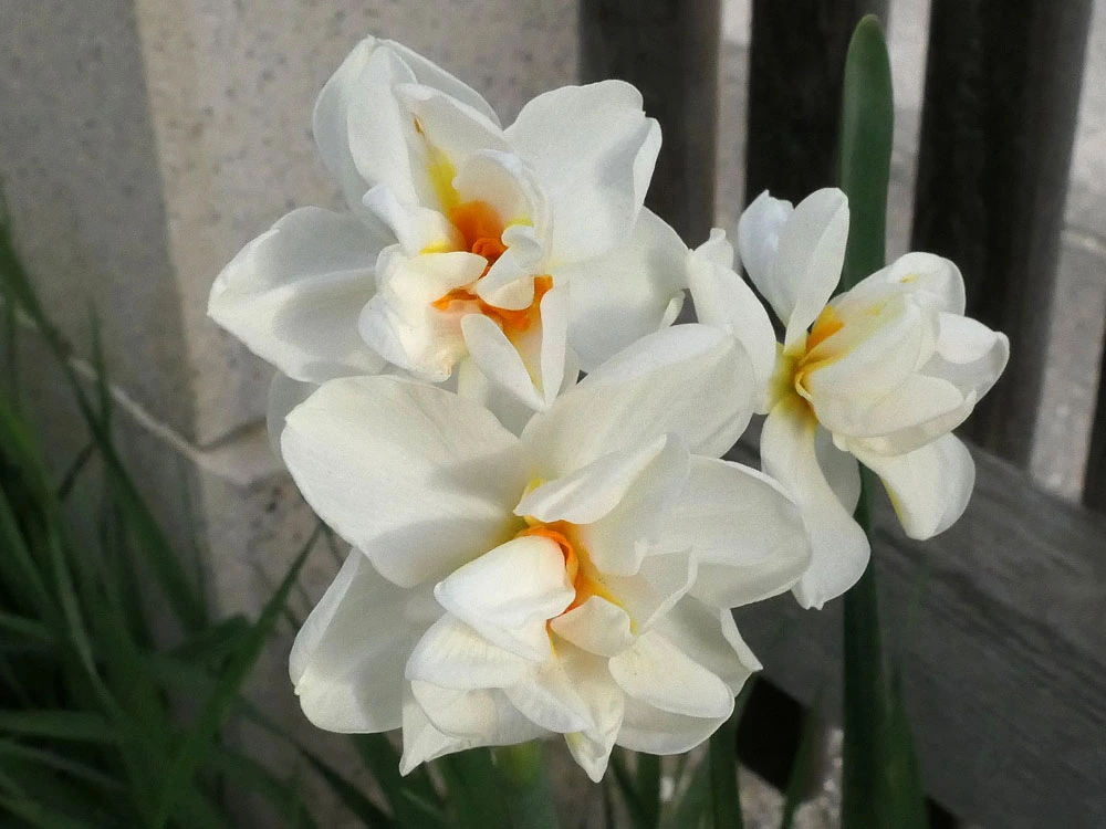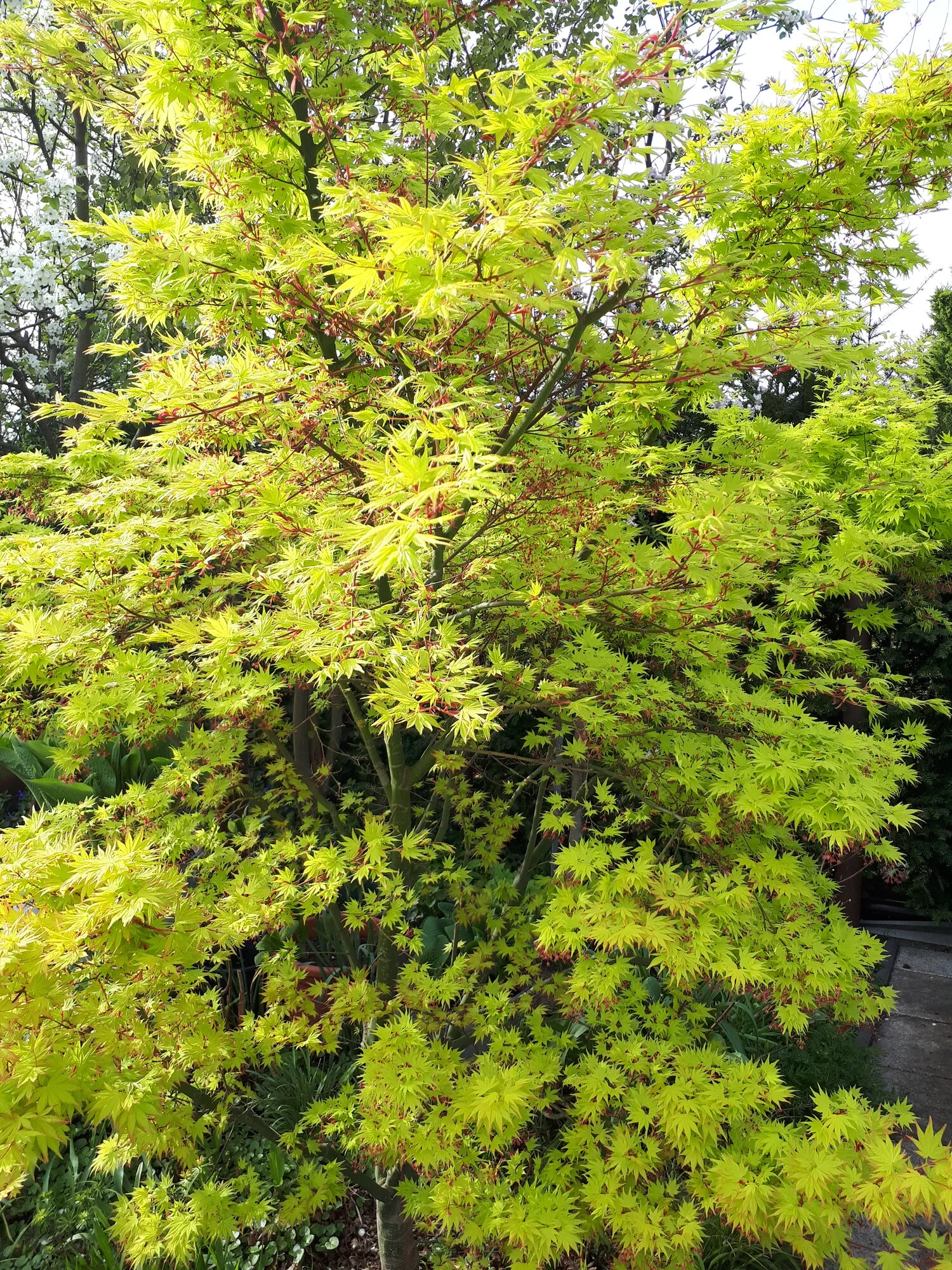 Narzisse 'Bridal Crown', Muscari 'Baby Breath', Mondviole und Flieder. Die April-, die mittleren und die Mai-Tulpen gleichzeitig, begonnen haben sie mit nur zwei oder drei Tagen Unterschied. Die frühesten sind innerhalb weniger Tage verblüht und somit vorbei, die ganz späten werden nicht mehr lange brauchen.