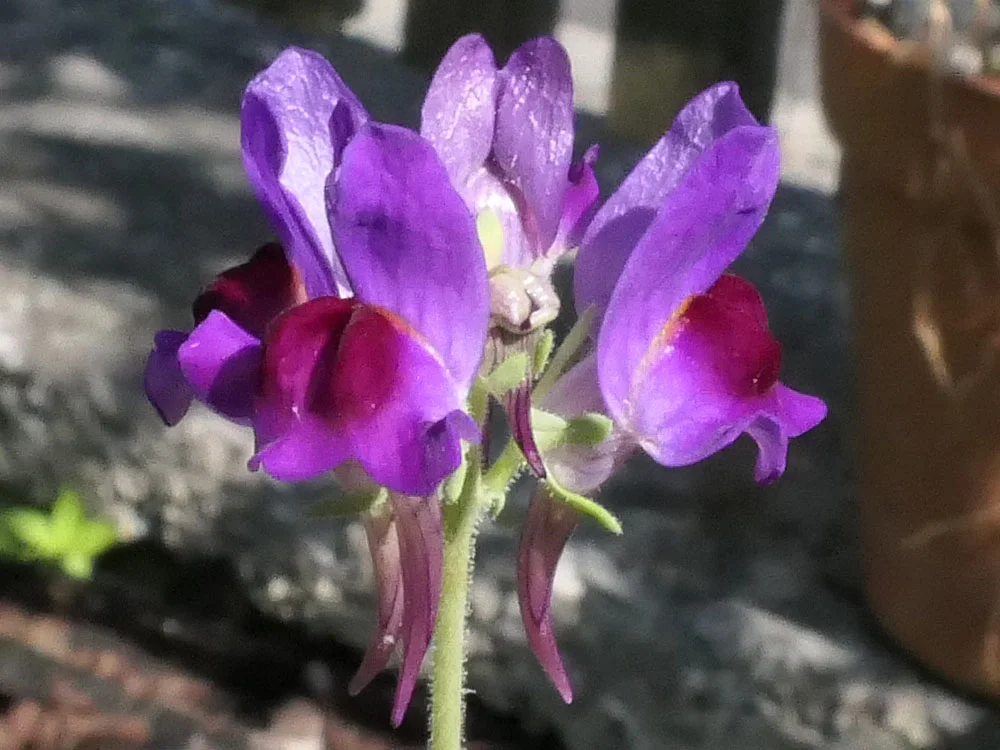 Die erste Blüte von Asarina scandens, Linaria aeruginea und eine der zu spät gesetzten Anemone coronaria