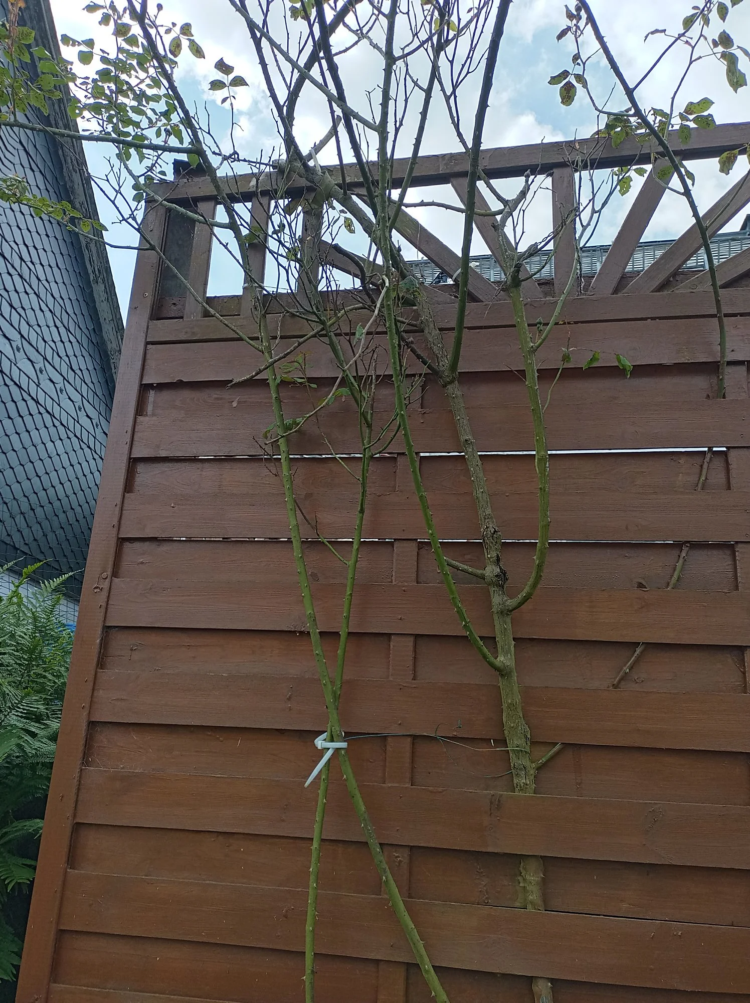 Im nächsten Frühjahr den dicken alten Trieb rechts direkt am Boden absägen und die dünneren Triebe etwas einkürzen und die dann noch vorhandenen Seitentriebe auf 4 bis 5 Augen schneiden. Außerdem diese Triebe bogenförmig anbinden damit die Rosen an der Holzwand blühen und nicht irgendwo ganz oben.