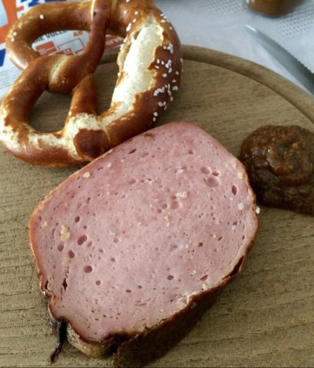 Ebenso ein Stück Streichwurst zum portionieren, eine Schale mit einem selbst "angemachten Streichkäse ein angebatzter".