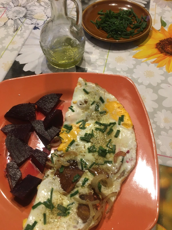 Bratkartoffel-Spiegelei Frühstück mit frischem Schnittlauch gehabt,ich dazu Rote Bete