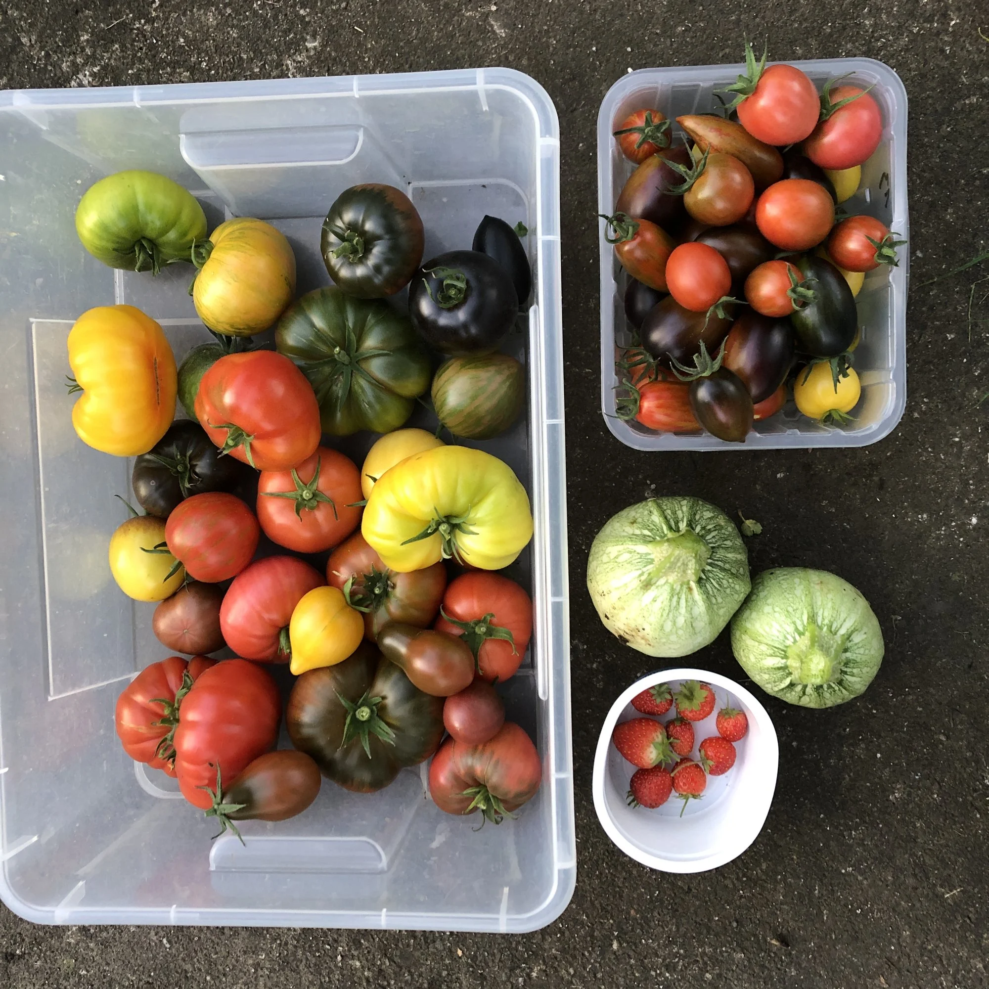 Ich habe Äpfel, Tomaten, Tomatillos (ohne Bild) und Trauben geerntet.