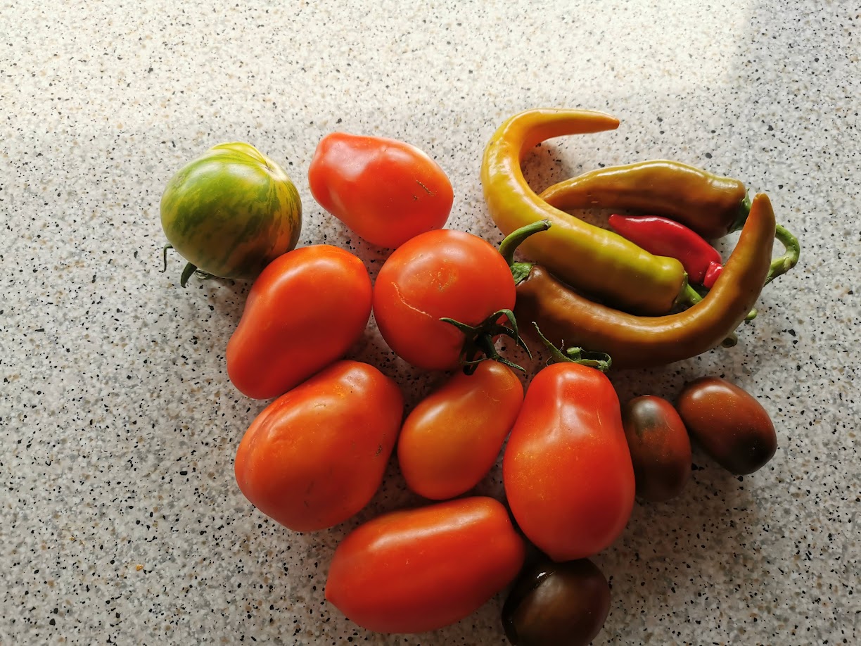 (Der Nachbar, dessen Gewächshaus ebenfalls mehr hergibt, als 2 Menschen verbrauchen können, hat jetzt einen Korb zur Selbstbedienung an seinen Zaun gehängt. Den Leuten scheint's zu gefallen, kommt gut an. Da packen wir dann auch was dazu, abends ist es weg.)