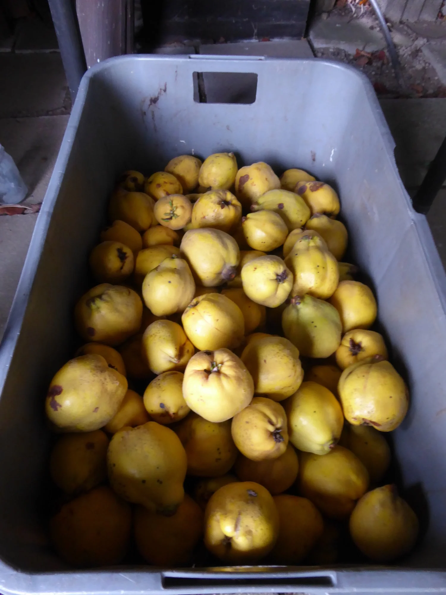 • Als ich letzten Samstag in den oberen Garten kam und um die Hüttenecke bog, duftete es nach Quitte und ein Teil der bisherigen Ernte stand da.