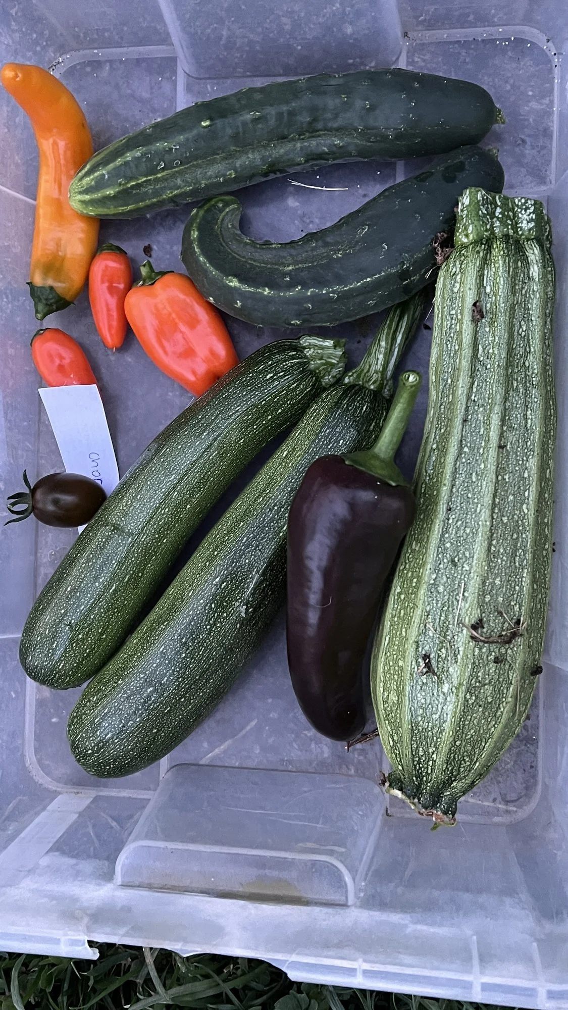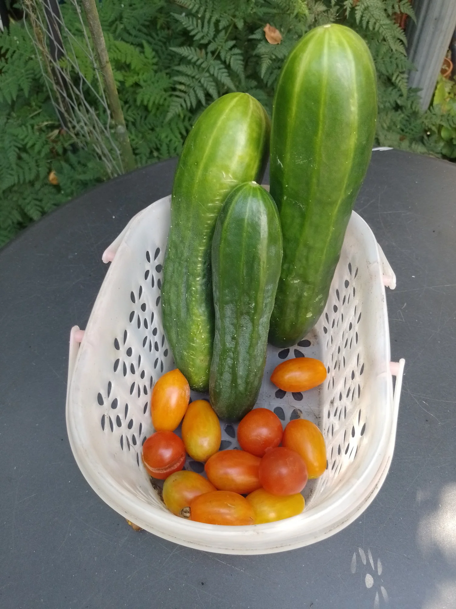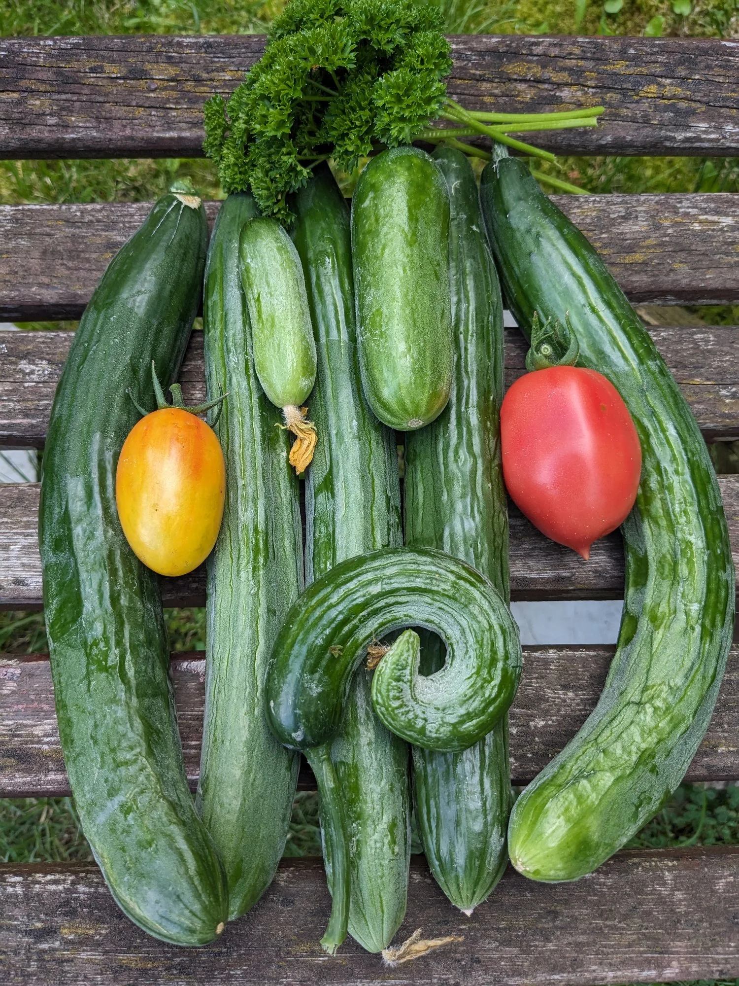 Gestern 2 Gurken, 1 Snackgurke und ein Schälchen Brombeeren. Die Info an die zu Hause bleibenden,dass die Beeren im Kühlschrank sind hat wieder nix genutzt. Ich werde sie also nachher in ein Glas Jogurt schmeissen und mit auf Arbeit nehmen. Pha... Banausen das...😜