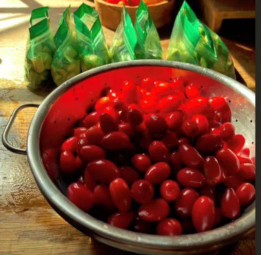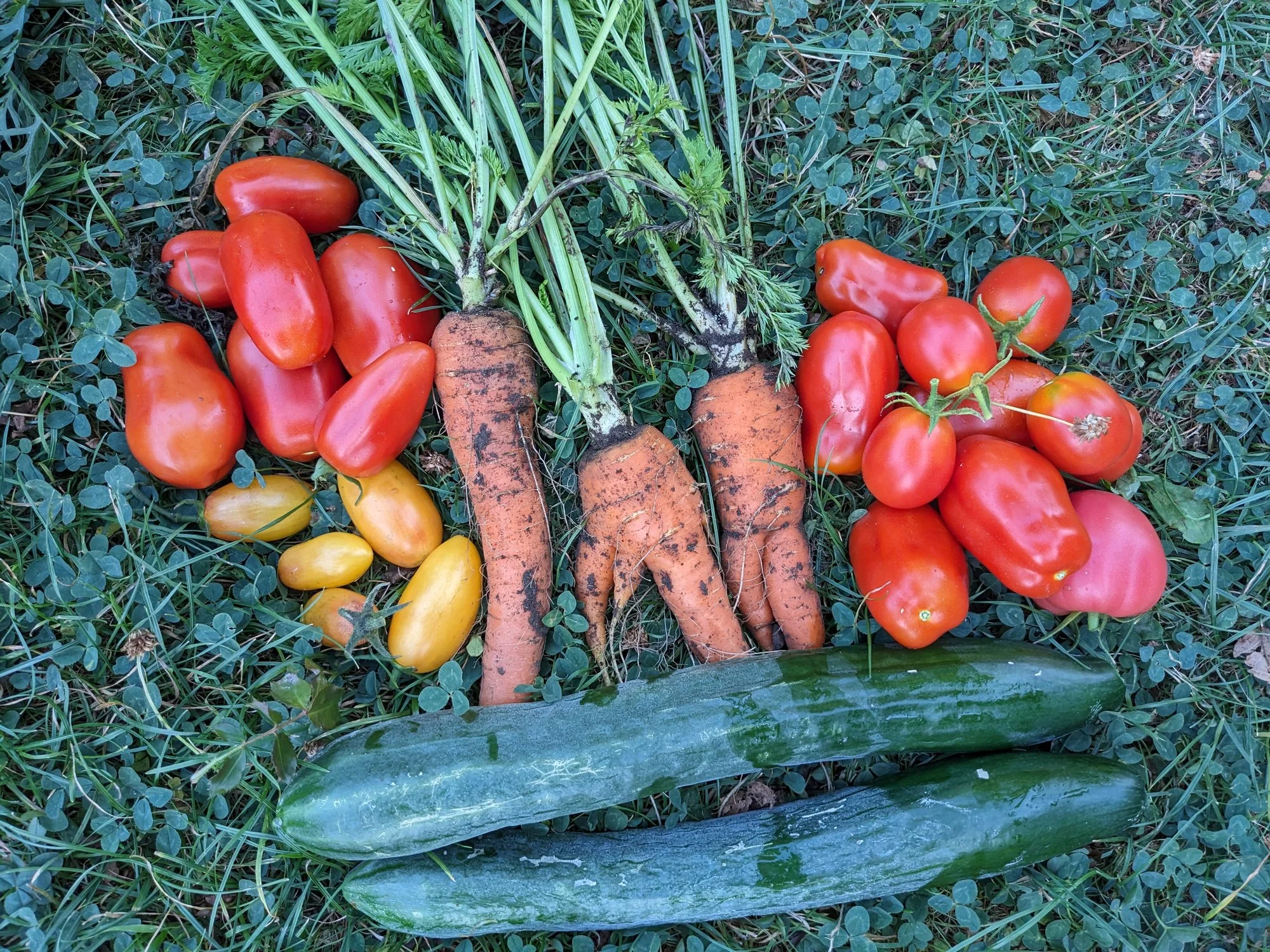• eine Menge Tomaten, 1 Gurke, zu viele Zucchini ...die friere ich ein.....und die letzten Feigen. Die waren dieses Jahr enorm. ...Quanti-und Qualität...Die ersten Kornelkirschen. Das soll die beste Marmelade überhaupt sein....ich bin gespannt