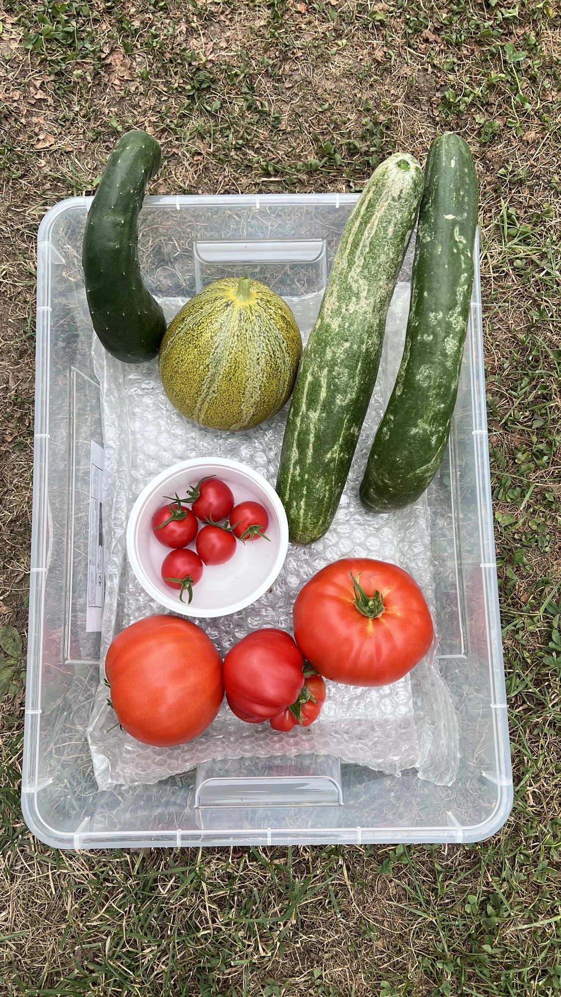 • 5,7 kg Tomaten, eine Zucchini, eine Melone, Kräuter (Rosmarin, Oregano, Thymian)