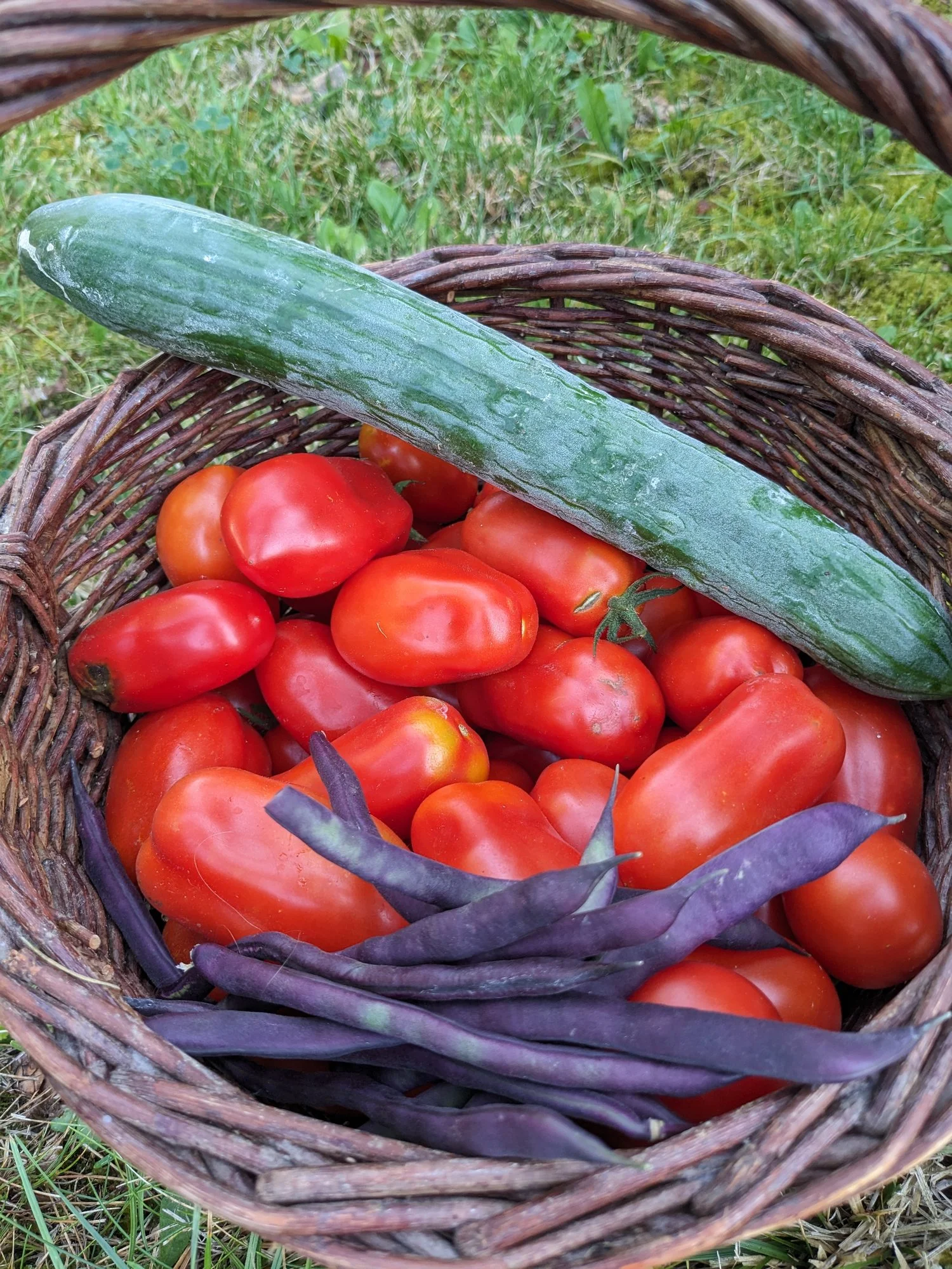 Ca 4 kg tomaten, 3 gurken und 10 spitzpaprika, und mangold fürs mittagessen