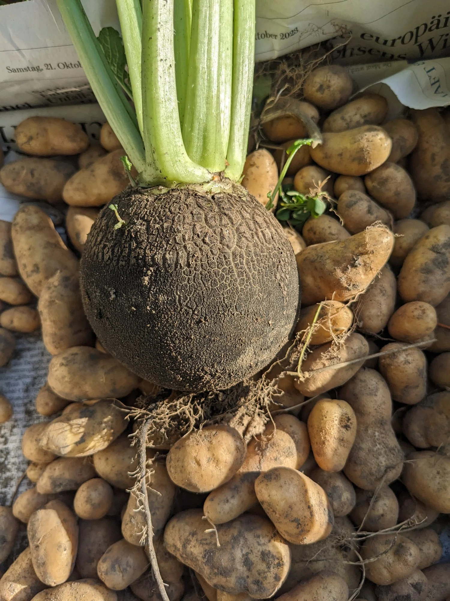 Hab doch nochmal 10 Tomaten abernten können. Gut sie sind nur noch halb so groß aber egal. Hängen noch grüne drann, die werde ich vielleicht am WE abnehmen und einwickeln. Die Pflanzen an sich sind so ziemlich am ende und werden dann auch entsorgt.