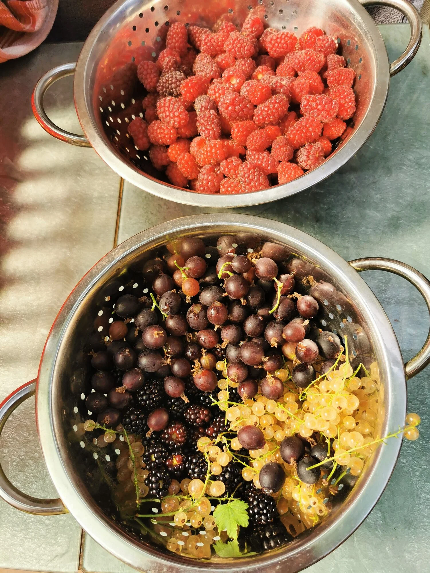 Heute habe ich wieder Loganbeeren , Brombeeren , Jostabeeren und ein paar weiße Johannisbeeren geerntet, alles für den Rumtopf