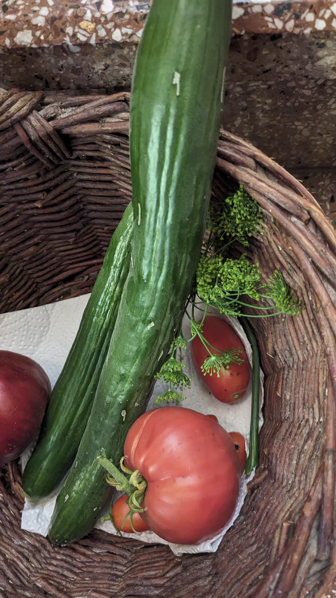 Ein paar Tomaten, zwei Auberginen, eine Zucchini, eine Paprika.