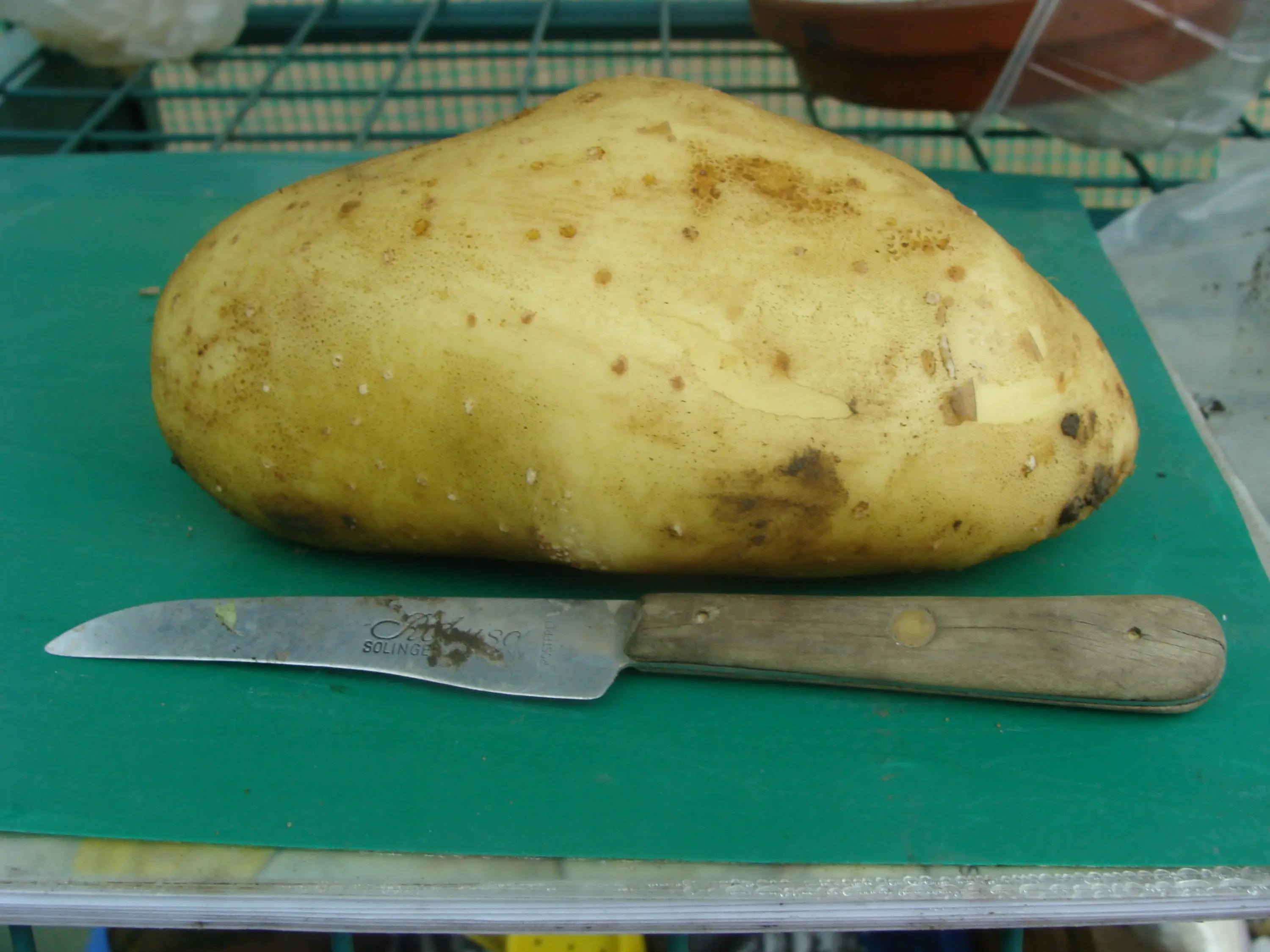 Die obere Reihe sind Bamberger "Hörnchen" Ich habe keine Ahnung warum die Kartoffeln in diesem Jahr so groß sind. Weil, das sind keine Einzelfälle. Ich habe die benannten Hörnchen, Sieglinde, Linda und eine französichen Sorte deren Namen ich aber vergessen habe gelegt, und bei jeder dieser Sorten sind solche Bollermänner bei, manche mit 500g. Ich stelle mir immer vor jemand will abnehmen und sagt, ich habe aber doch 3 Kartoffeln gegessen. Könnte ich mich kaputt lachen darüber.