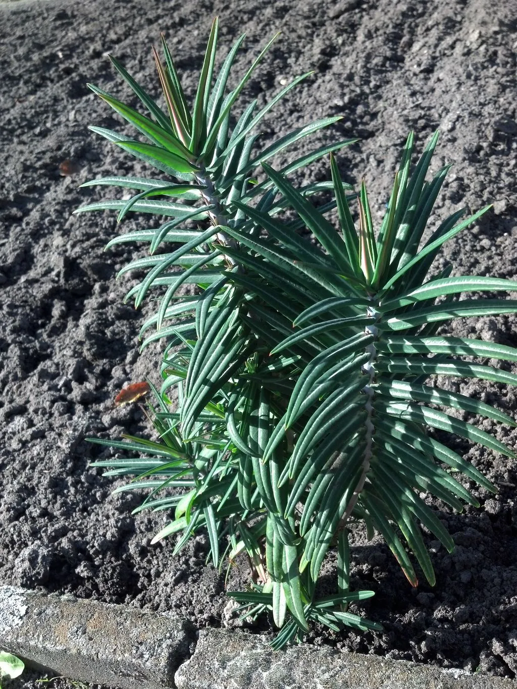 Hallo zusammen, auf der Namensuche für meine Planze bin ich auf dieses Forum gestoßen. Ich hoffe das ich auf diesem Wege endlich eine Bezeichnung für die "Palme" erfahre. Wie bereits im Thread-Titel erwähnt kenne ich die "Palme" bereits aus Kindertagen nur als "Maulwurfspalme". Sie wächst eigentlich überall im Garten und soll angeblich Maulwürfe vertreiben, daher der Name. Die Planze hat ein palmähnliches Aussehen, einen rötlichen Stamm, der nach oben ins weiße übergeht. Die spitz zulaufenden Blätter haben in der Mitte einen hellen Streifen. Sie bildet im Sommer grüne Knospen (habe leider kein Foto davon) die dann reifen und irgendwann aufplatzen und kleine dunkle Samen (2-3 mm Durchmesser) freisetzen. Dadurch vermehrt sie sich sehr schnell und die Samen können auch wohl mehrere Jahre überwinternbevor sie im Frühjahr zu wachsen beginnen. Ich bin gespannt, ob jemand diese "Palme" kennt. Schönen Abend noch