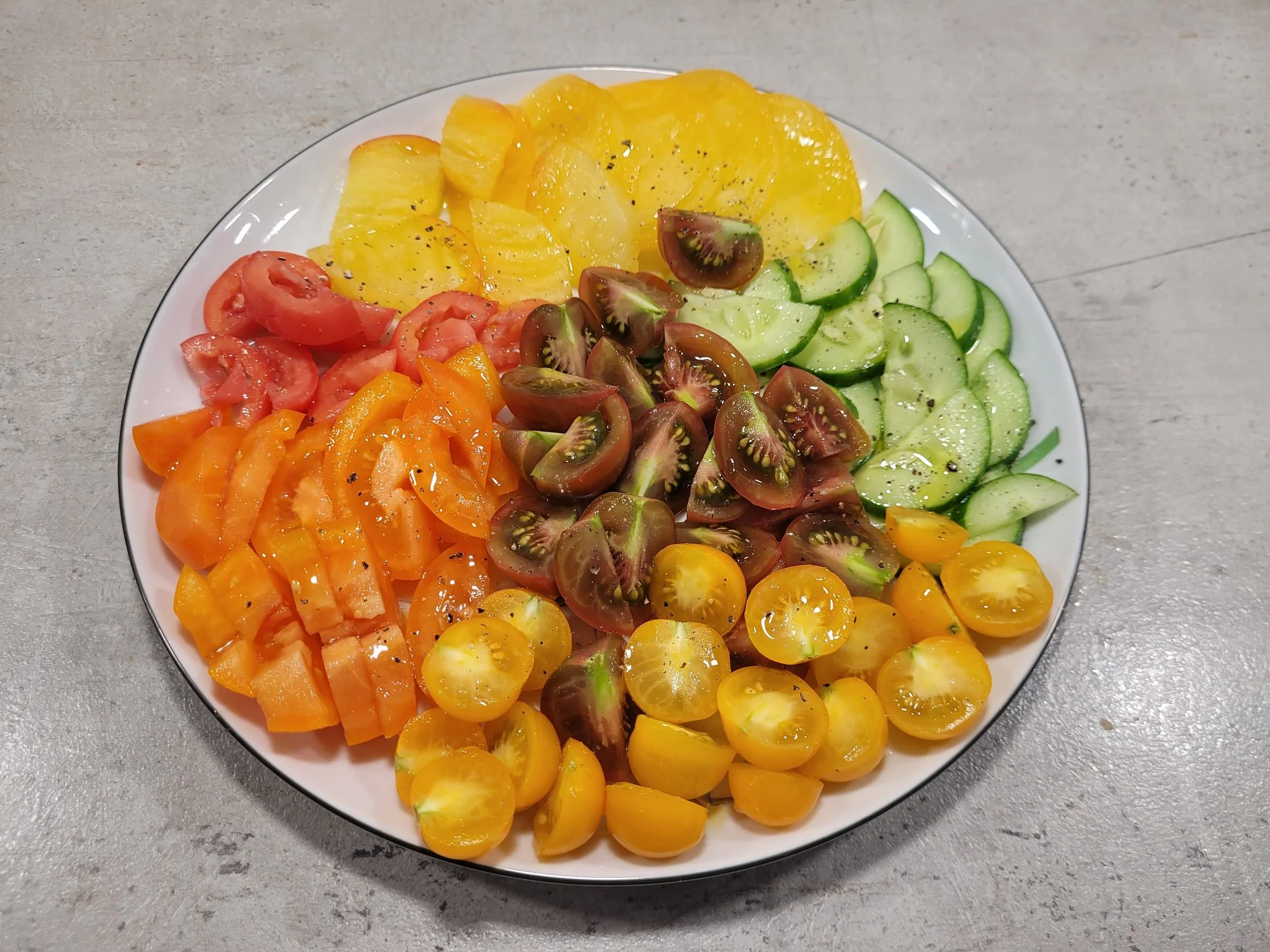 Mhm wie, sieht das lecker aus!!!!Einen großen Teller Tomaten mit etwas Gurke und auf einem separaten Tellerchen war Büffelmozzarella