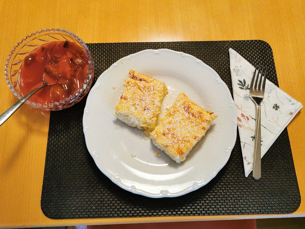 Vegetarisch? Eher zufällig vegetarisch.Heute kommt die Enkelin Mittagessen und wünscht sich Vegetarisches - gebackenen Milchreis mit Pflaumenkompott- Oma macht das natürlich....![]()