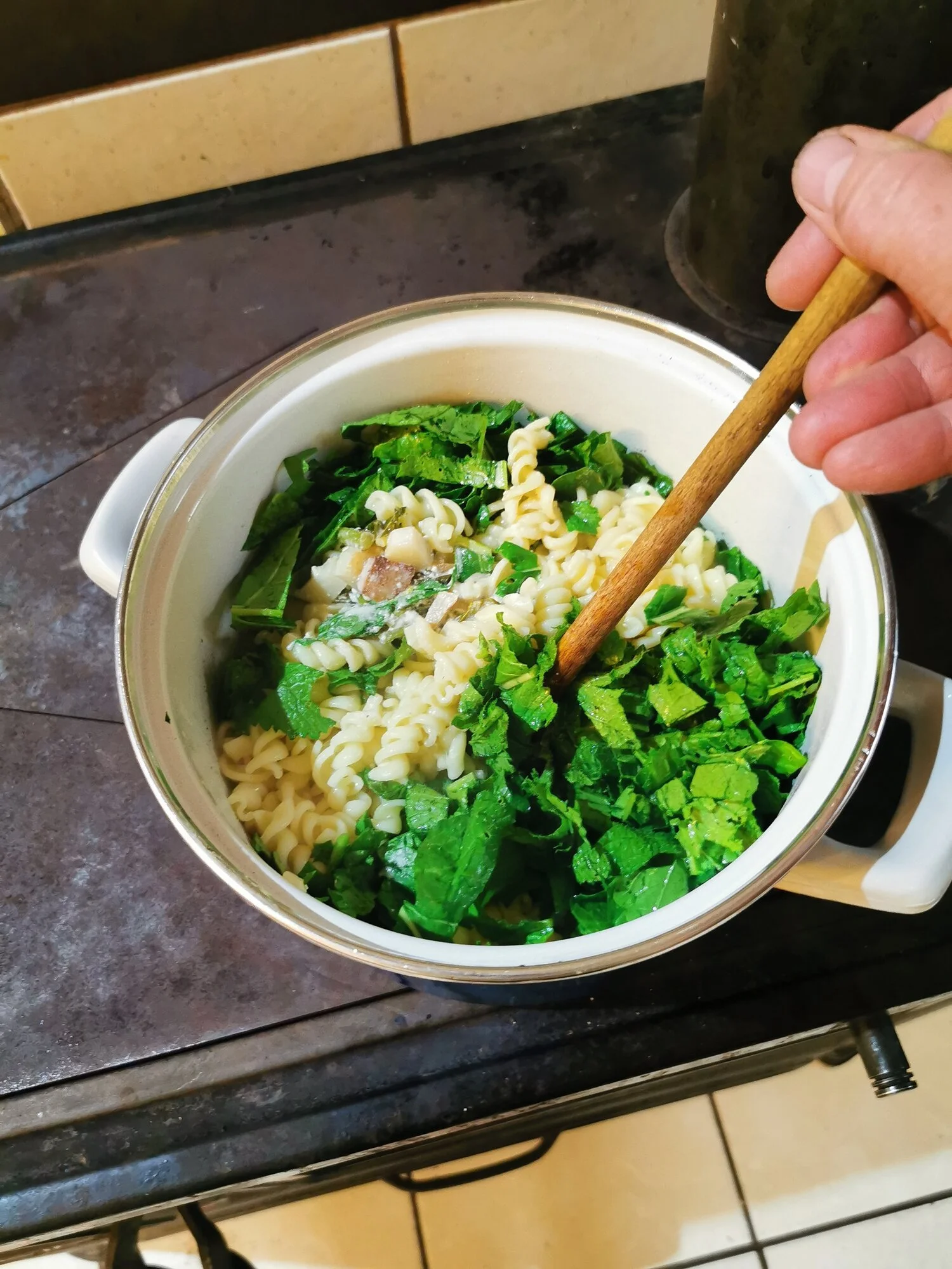 Mairüben - Stielmus - Ziegenkäse Sahne Soße mit Nudeln, alles zusammen in einem Topf