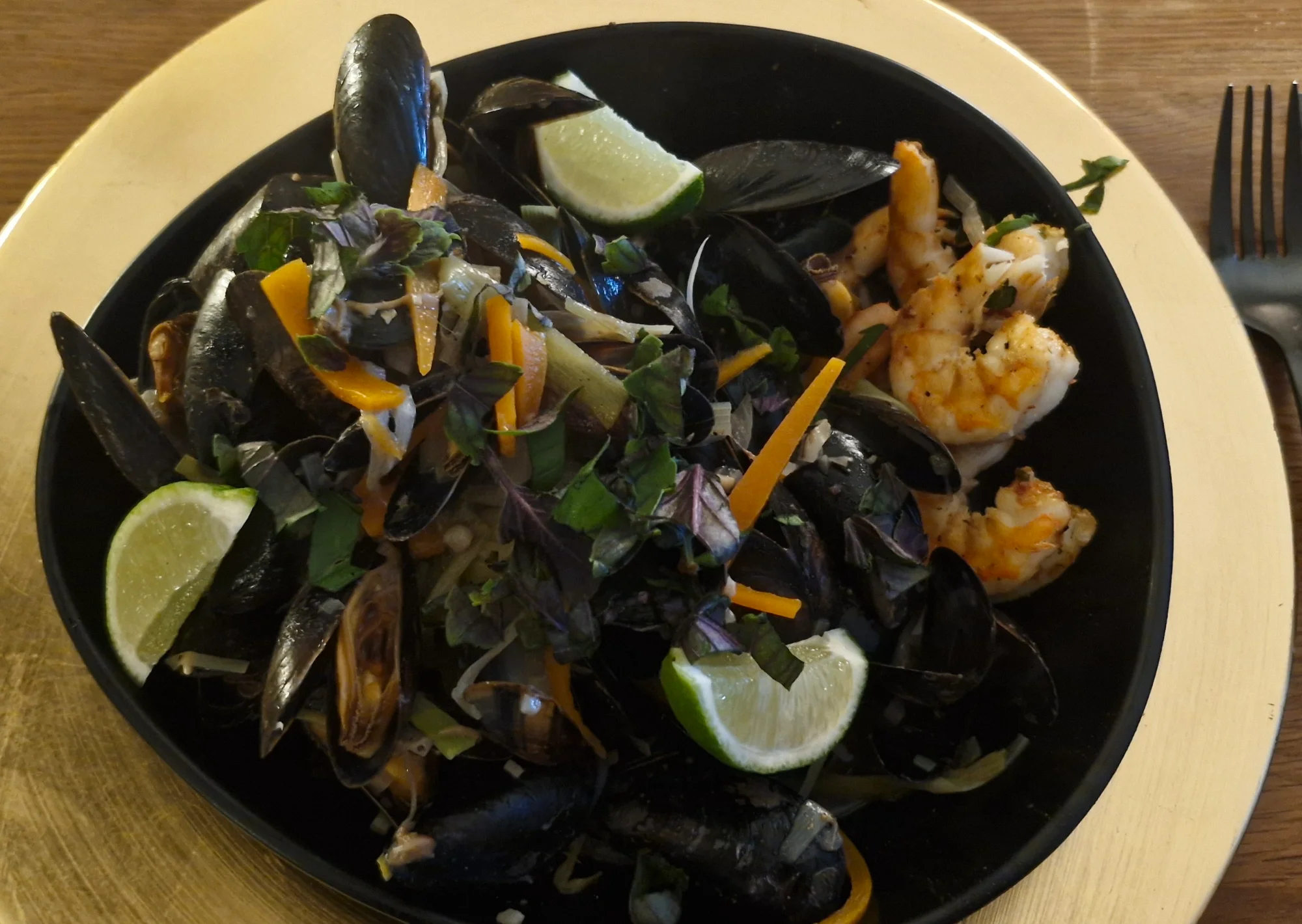 Die Kürbissuppe wird morgen gegessen, das ist alles zu viel geworden - ich bin satt!Kürbissuppe aus Butternutkürbis und nachher ein paar Bratkartoffeln mit gebratenem Kürbis und gebratenen Champignons. Muskat-Weintrauben als Nachtisch