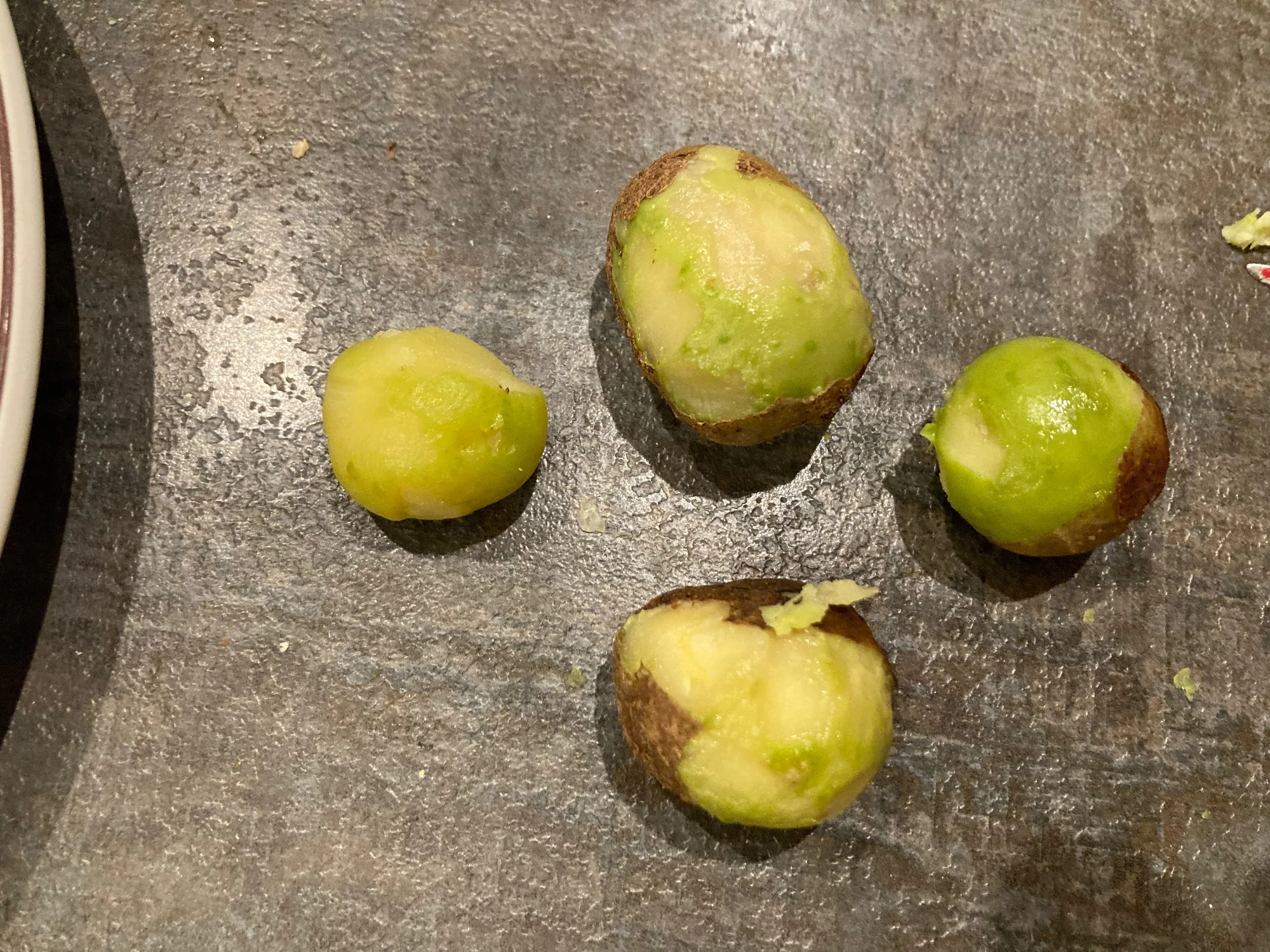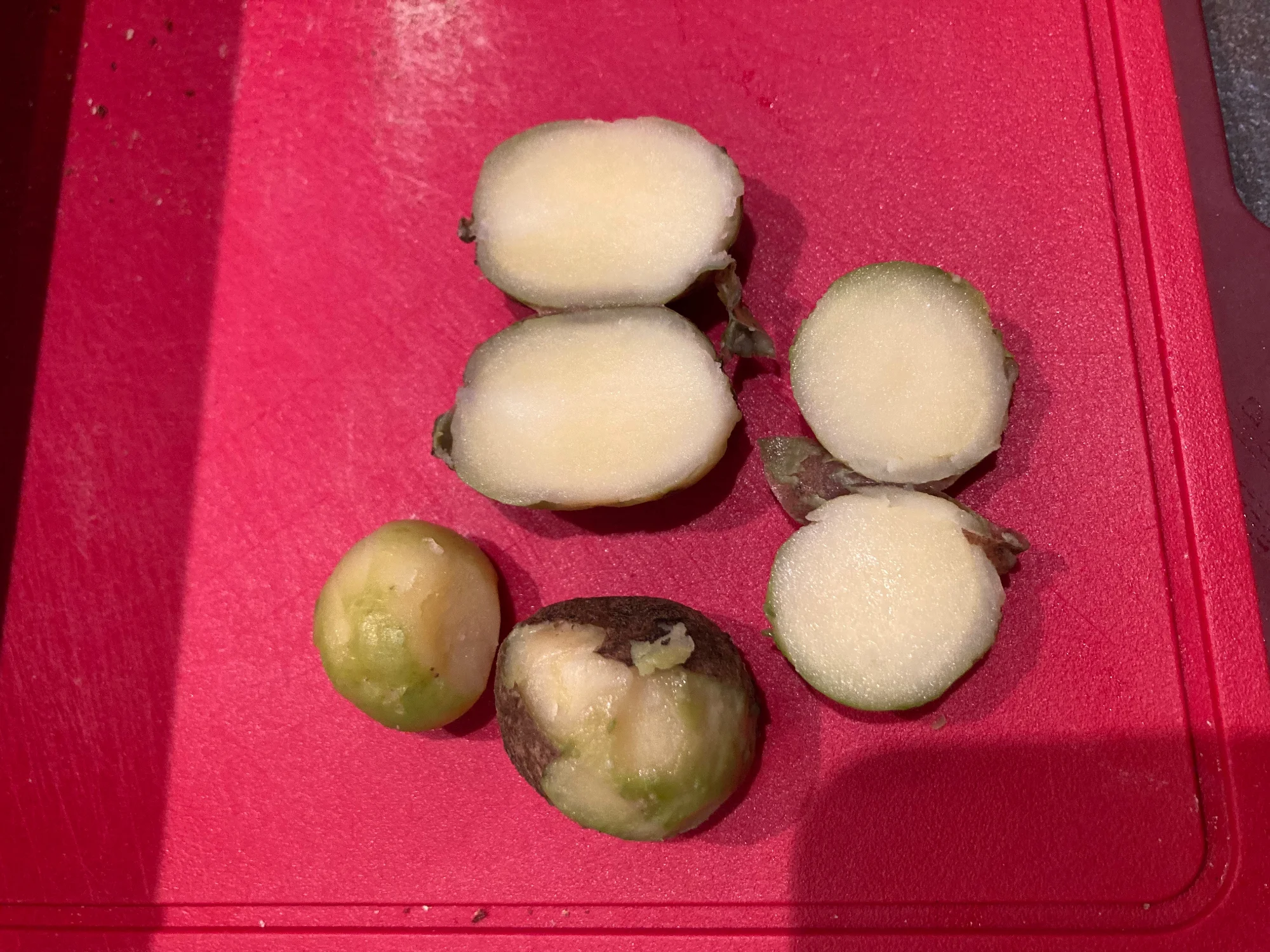 rechts die Runde, nur die Schale weg, bei den anderen, das grüne mit abgeschabt.