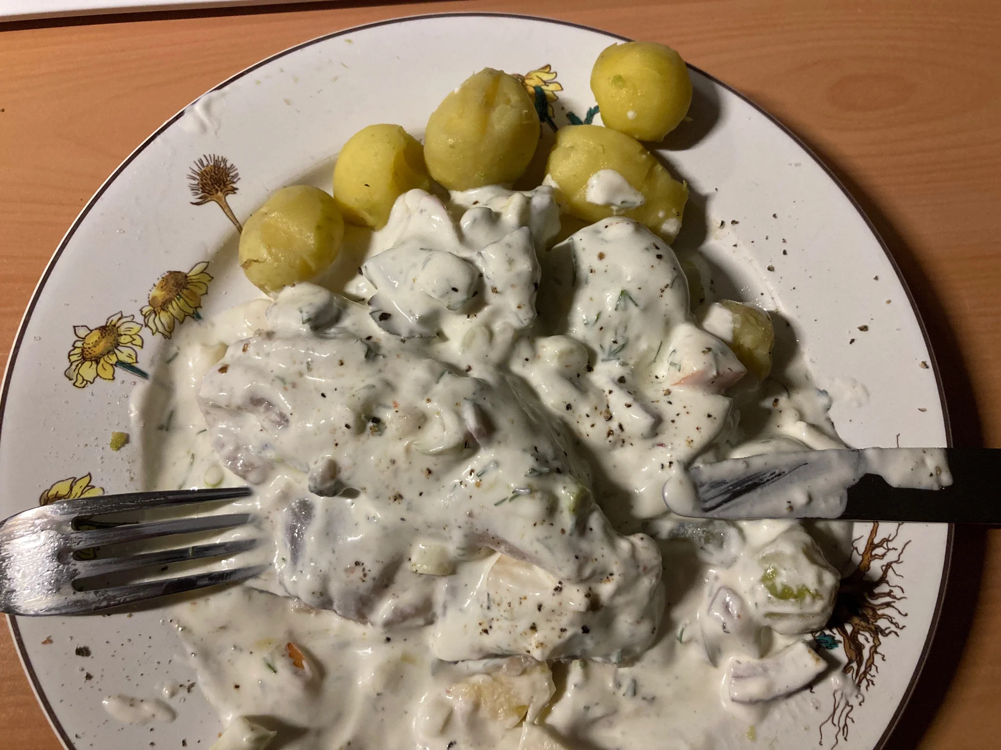 Vorhin gab es Matjes "Hausfrauenart" mit den neuen Minikartoffeln