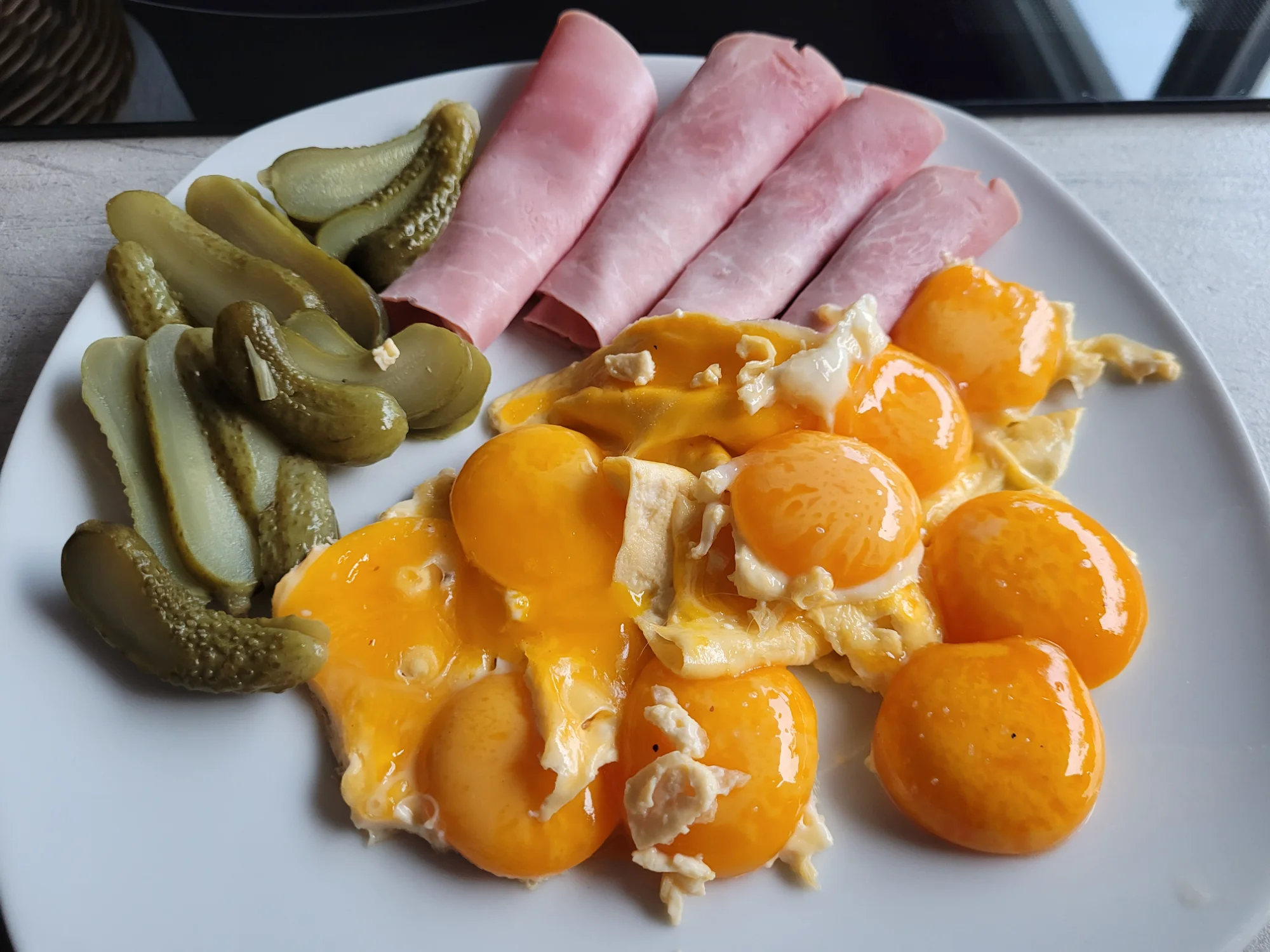 Gebratene Eigelbe, Omelette, Kochschinken und Essiggurken mit Bauernbrot
