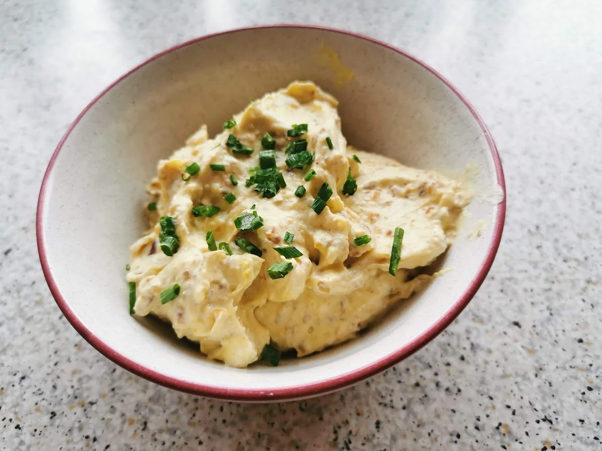 • Gestern und heute gab es mit Pilz-Sahnesauce überbackenes Hühnerbrustfilet und je 1/4 Rösti aus der 24er-Pfanne. Gestern gab es noch einen gemischten Salat mit Sauerrahmdressing, heute hatte ich keine Lust auf Salat.