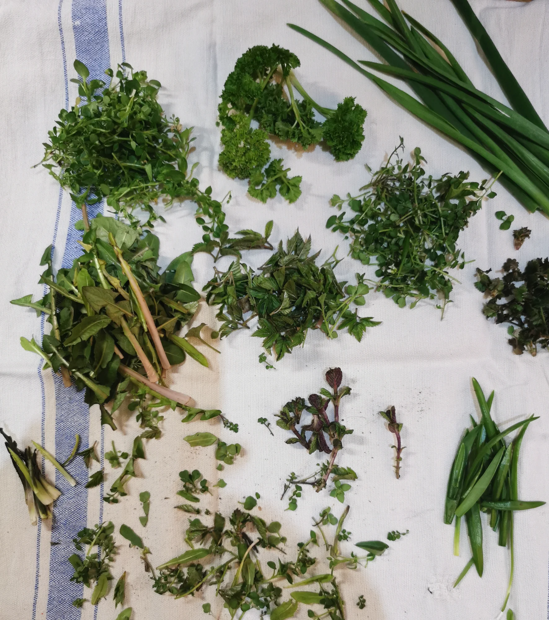 Löwenzahn, Girsch, Behaartes Schaumkraut, Vogelmiere, Meerettichsprossen,Minzespitzen, Gundermann Spitzen, Wunderlauch, Petersilie, Knoblauchgrün.