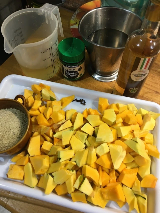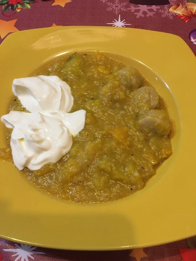 • Weihnachten gut gegessen gestern nur eine Kürbissuppe mit Grünkern und Markklößchen und etwas Joghurt,
