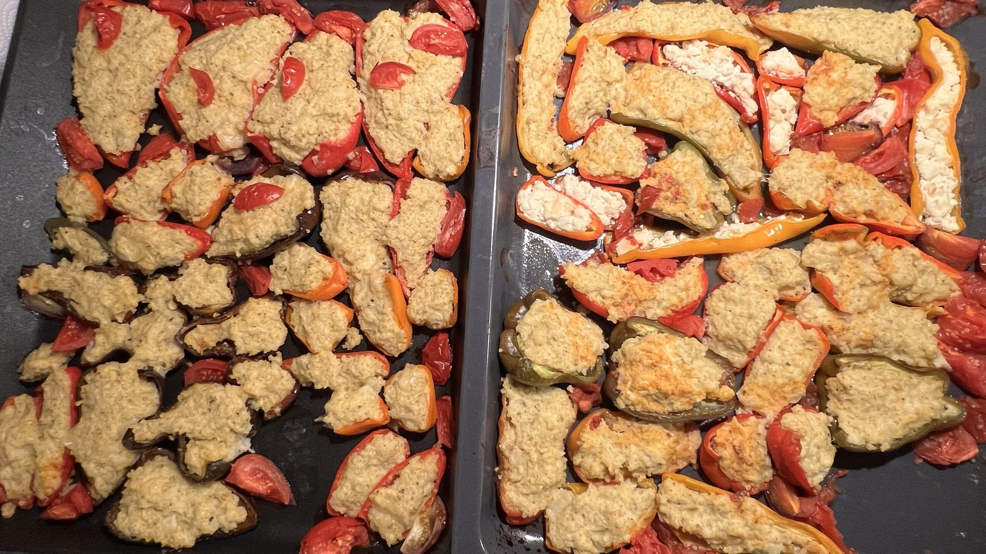 Dasselbe wie gestern, die Nuggets mit scharfer Mangosoße (habe ich selbst mal gekocht)Blumenkohl im Kichererbsenmantel, Paprika und Chili mit Hirsekäse-Kruste (2 Bleche). Suche noch jemanden für den Abwasch …
