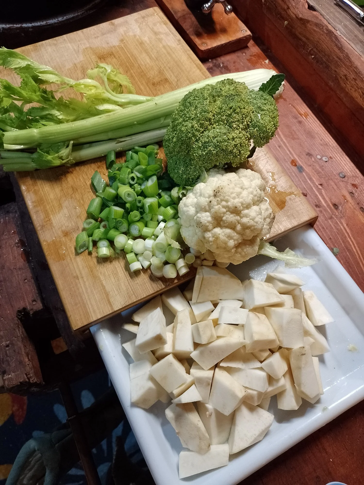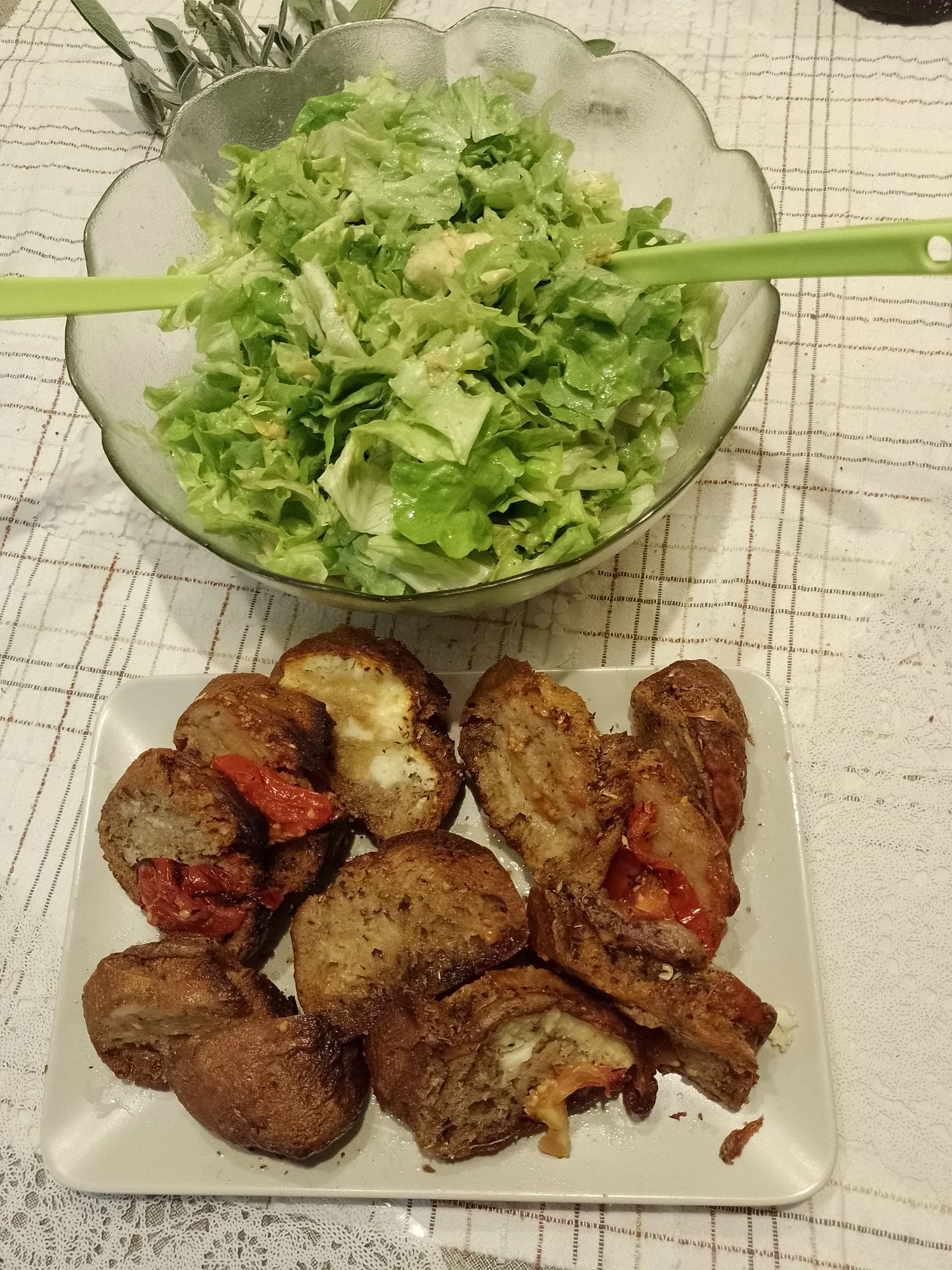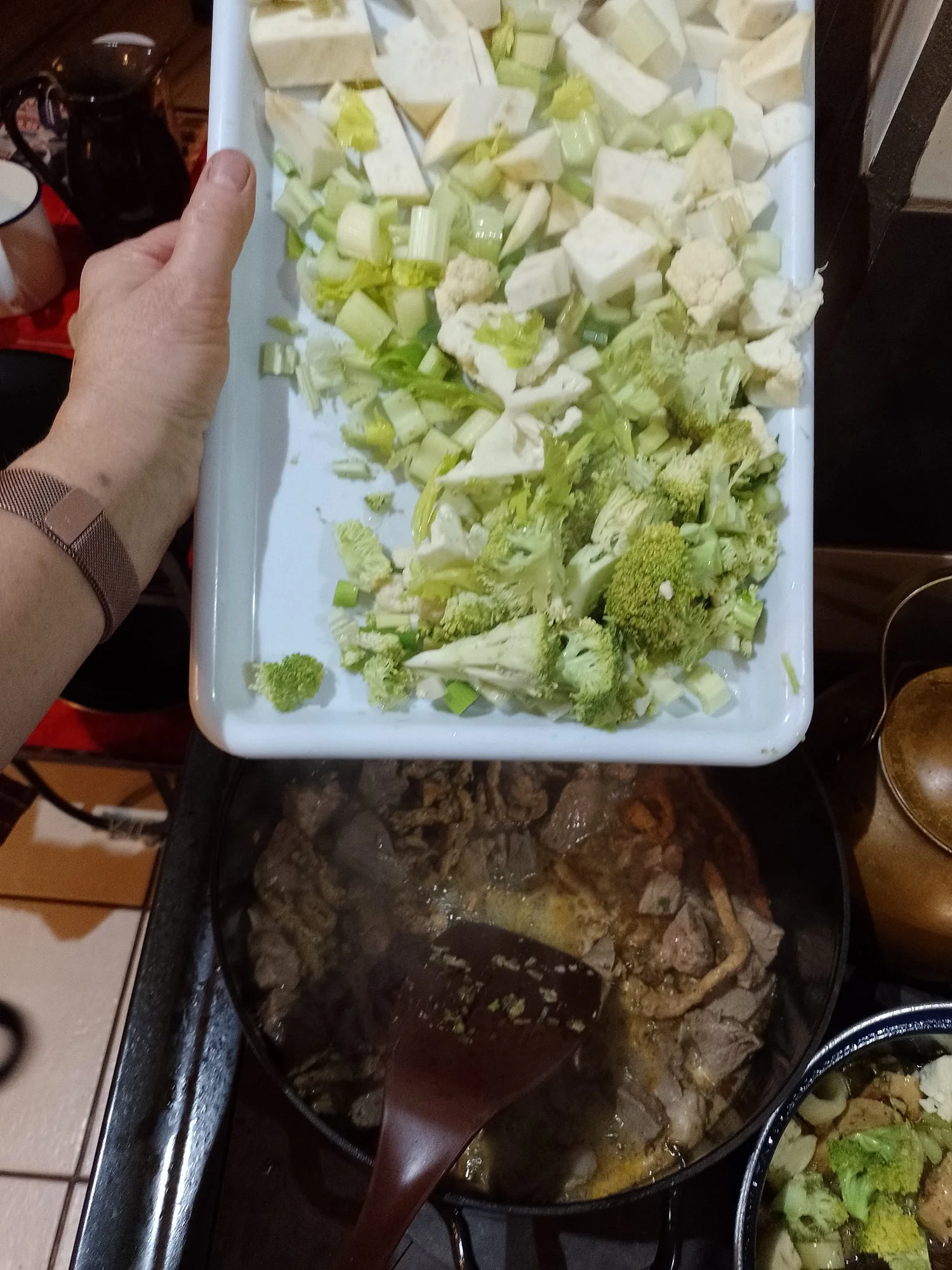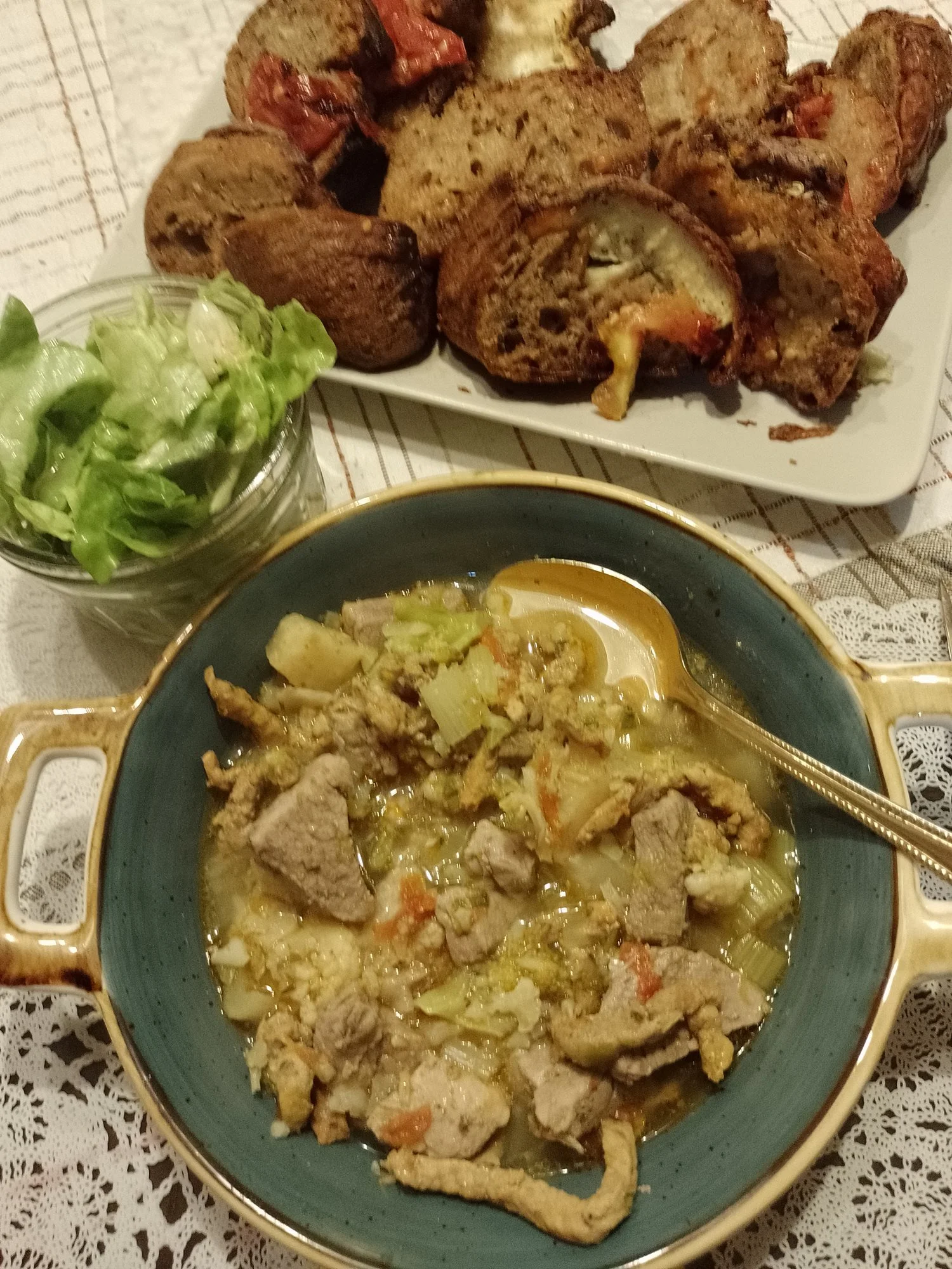 Klingt lecker! Treibst du so einen Aufwand für 2 Personen? Das ist wirklich beachtlich.Gemüsetopf mit Fleisch, dazu gebackenes Baguette mit Käse und Tomate und Salat
