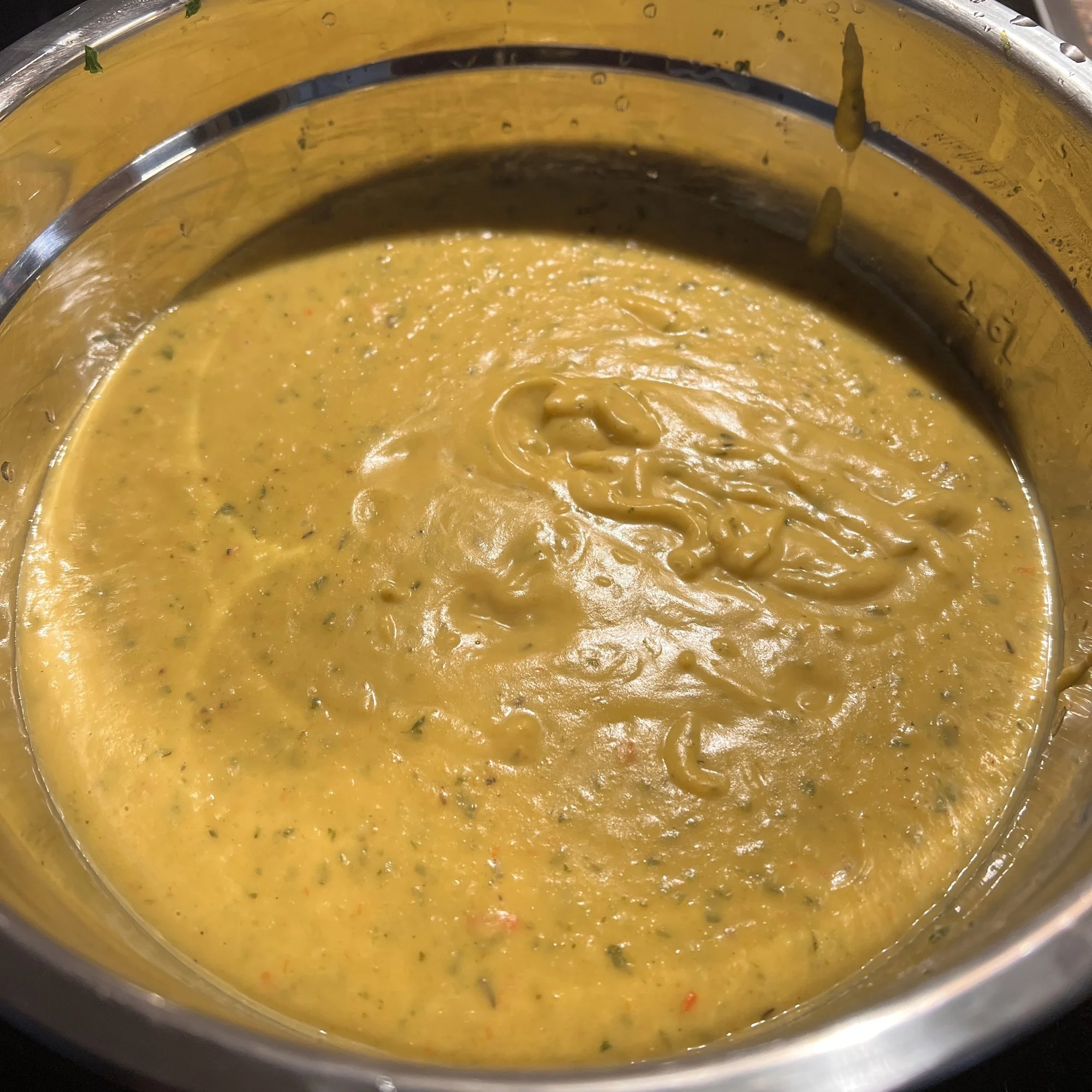Gehackte Petersilie, 2 Prisen Muskat, ½ Teelöffel Thymian, 200 g Frischkäse light und den geriebenen Parmesan dazugeben und 2 Minuten weiter köcheln lassen. Dann pürieren. Mit Salz und Pfeffer nach Belieben abschmecken.