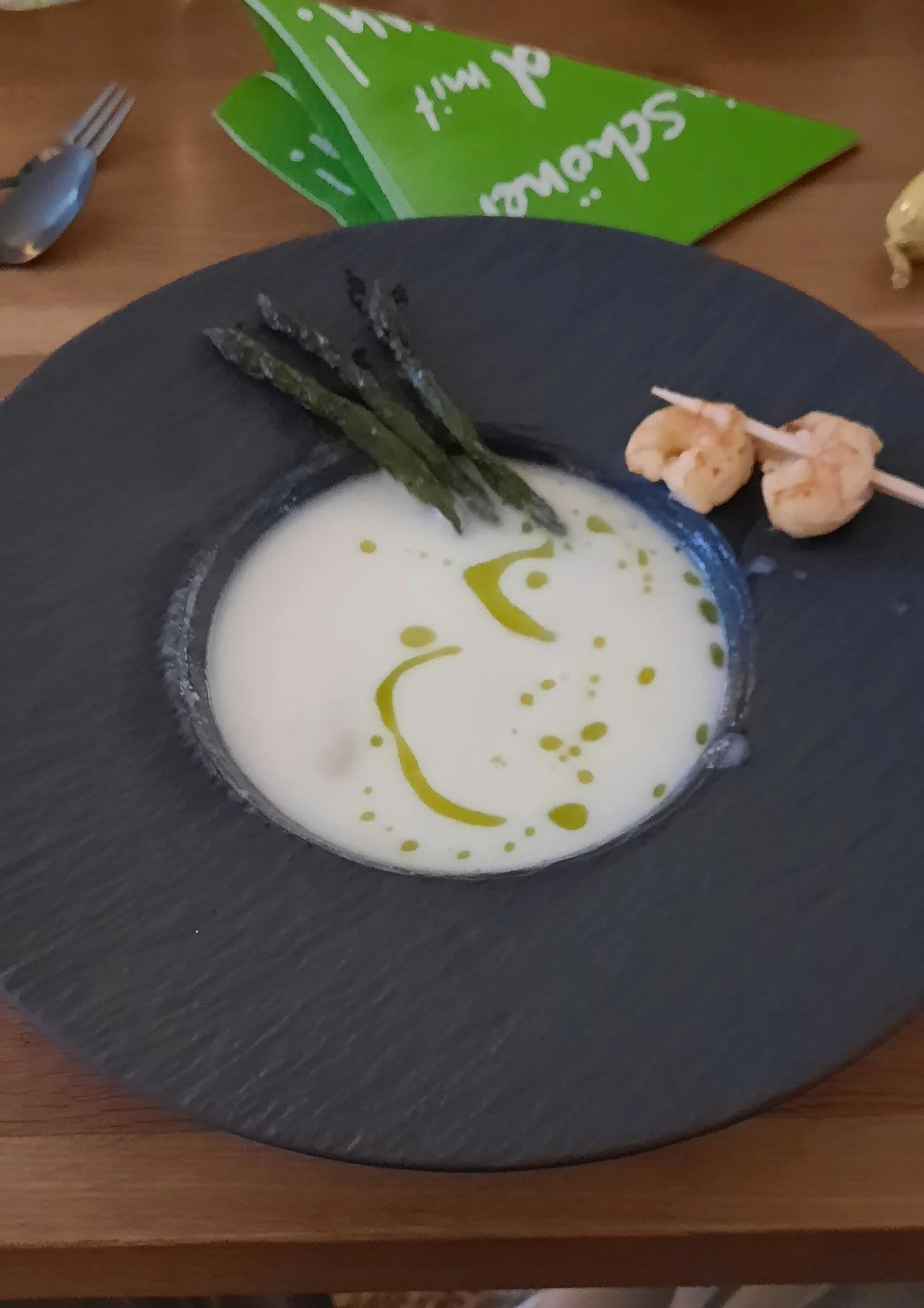Spargelschaumsüppchen mit Petersilienöl und Garnele