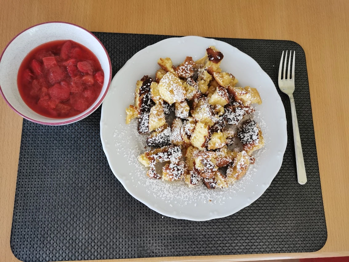 Hier gabs gestern auch Kaiserschmarrn. Heute wird ein (Kopf)salatpesto getestet um der Salatschwemme Herr zu werden. Abends ist Naanbrot, Curry und Beilagen geplant. Mal schauen ob ich das hinbekomme.