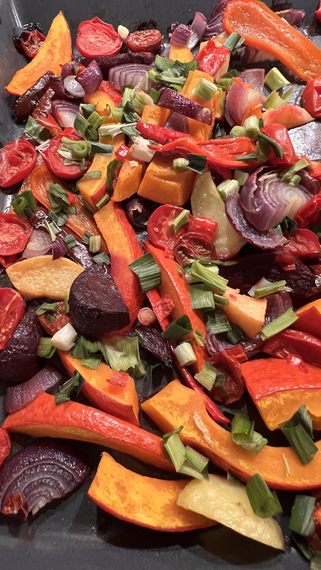 Oh, das hatte ich gestern, dazu ein schönes Kammsteak.Ofengemüse - unter anderem mit Kürbis und Süßkartoffel